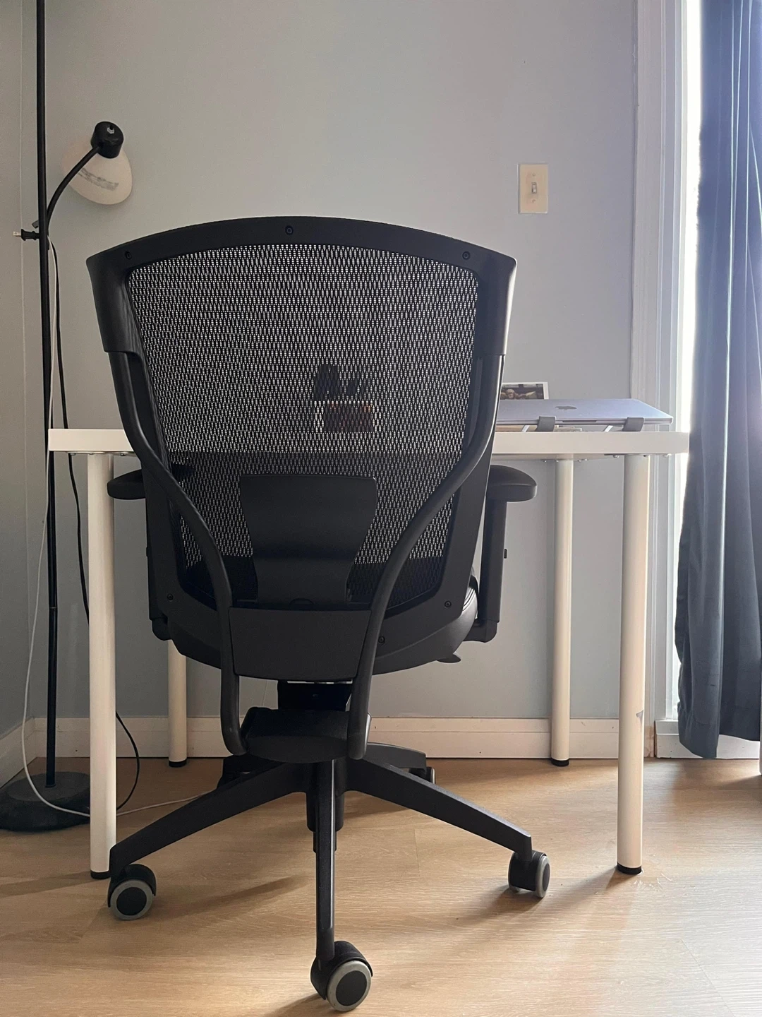 This black mesh office chair offers comfort and support for your workday. It features a breathable mesh back and padded seat. The chair has adjustable armrests and a sturdy base with wheels for easy mobility. Great option for a home office.