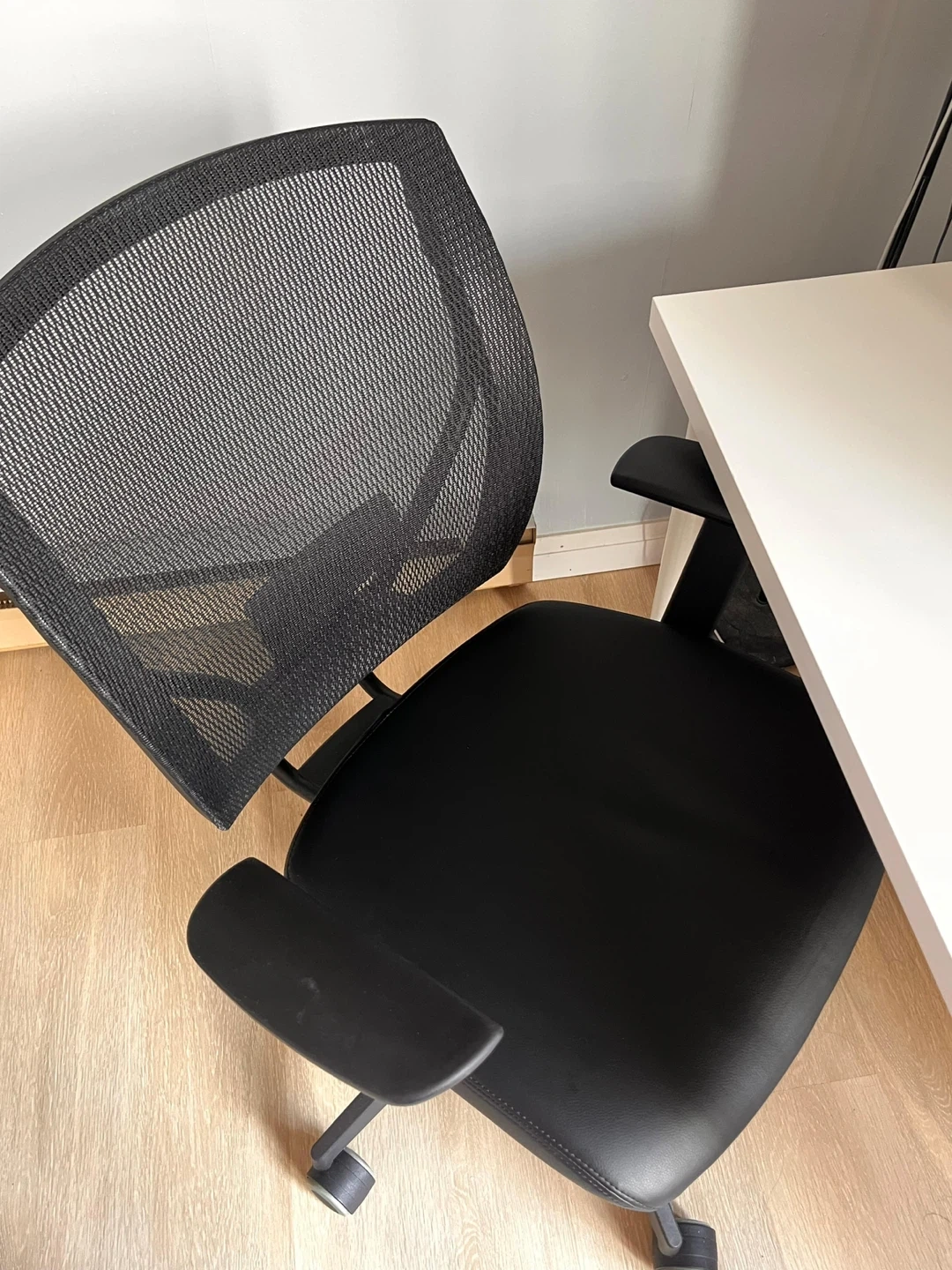 This black mesh office chair offers comfort and support for your workday. It features a breathable mesh back and padded seat. The chair has adjustable armrests and a sturdy base with wheels for easy mobility. Great option for a home office.