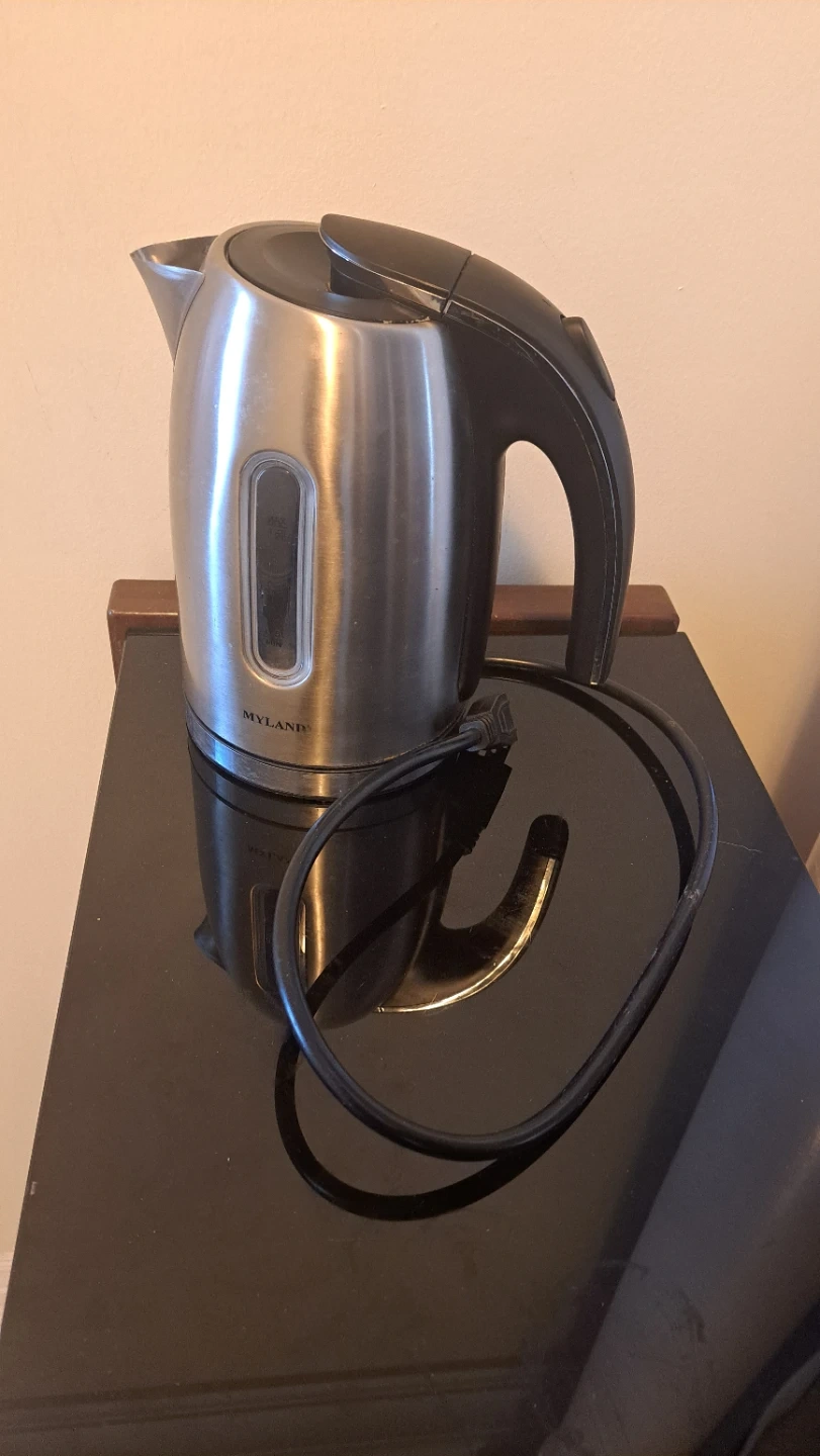 Stainless steel electric kettle from Myland. It has a water level indicator and a capacity of 0.5L minimum. This kettle boils water quickly for your hot beverages.