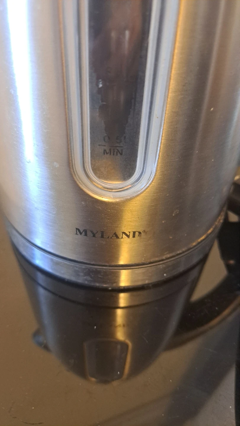 Stainless steel electric kettle from Myland. It has a water level indicator and a capacity of 0.5L minimum. This kettle boils water quickly for your hot beverages.