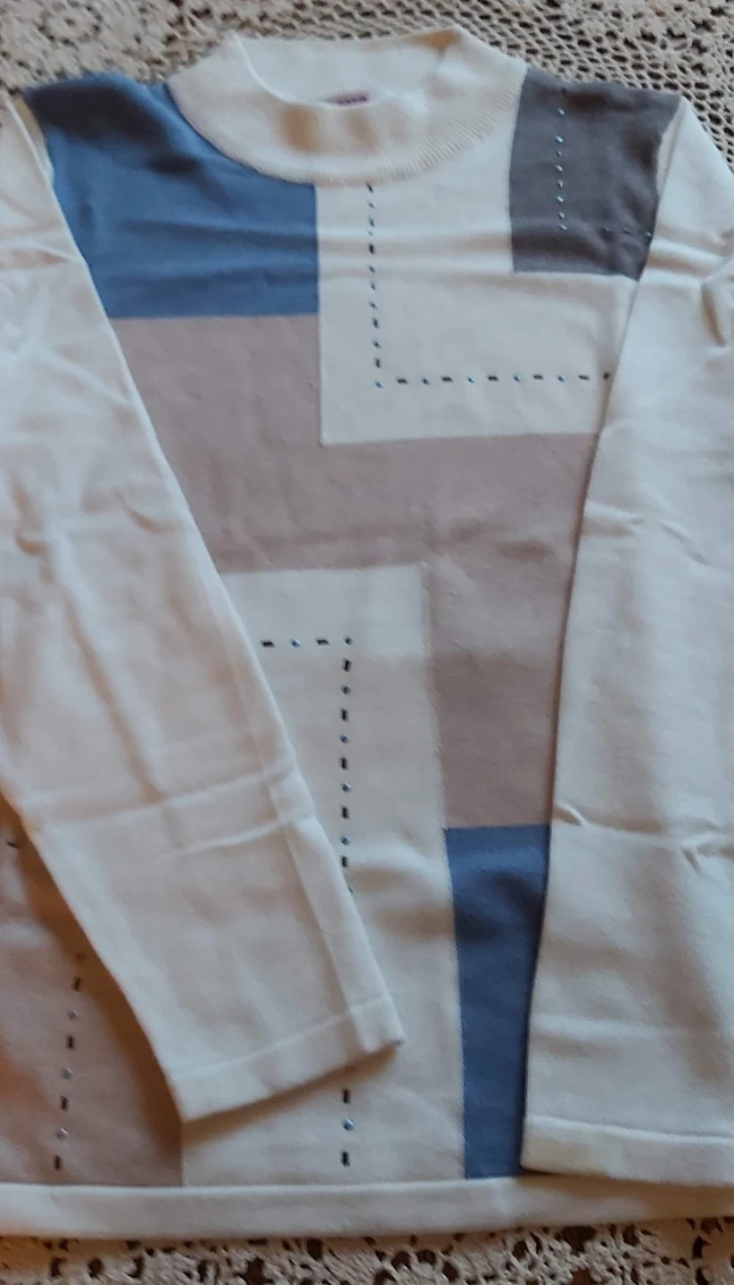 This Alia Petite sweater is made from a blend of 60% cotton and 40% acrylic. It features a geometric pattern with a mix of cream, blue, and grey blocks. The sweater is a size PS/P.