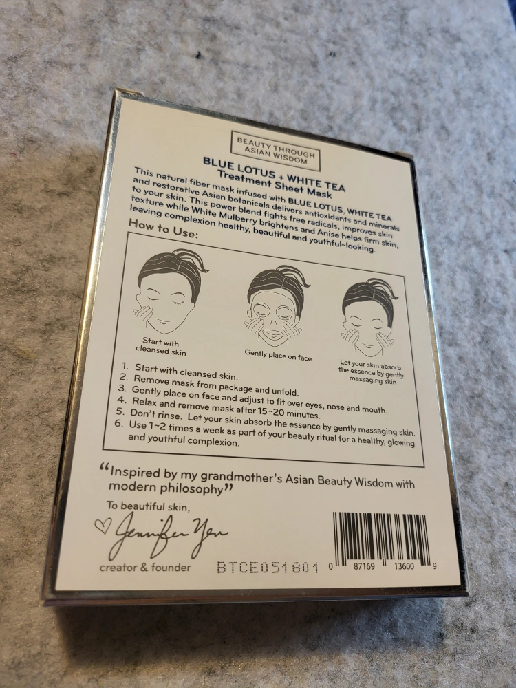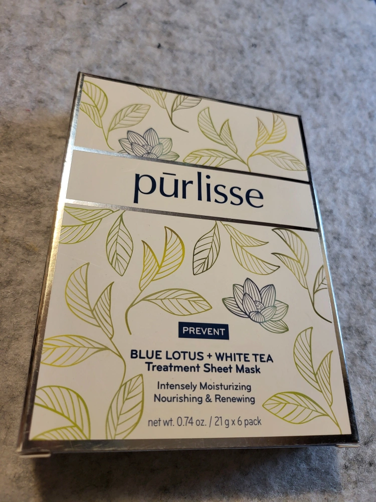 I'm selling a box of Purlisse Blue Lotus + White Tea Treatment Sheet Masks! These masks are intensely moisturizing, nourishing, and renewing for your skin. Each box contains 6 masks, with each mask having a net weight of 0.74 oz. Made with natural fiber infused with Blue Lotus and White Tea, these masks deliver antioxidants and minerals to your skin. They brighten and leave your complexion healthy, beautiful, and youthful-looking! You can use them 1-2 times a week as part of your beauty ritual.