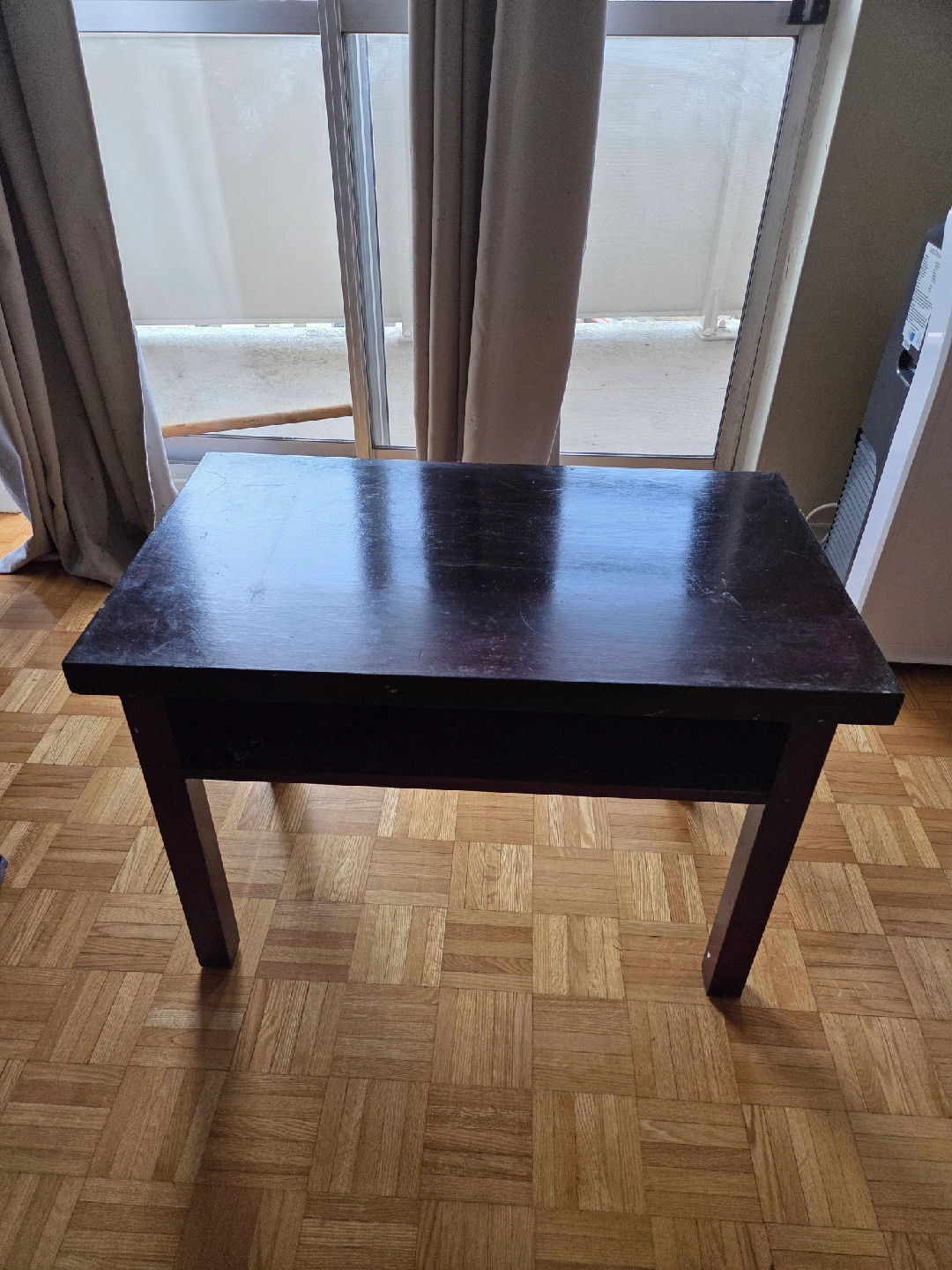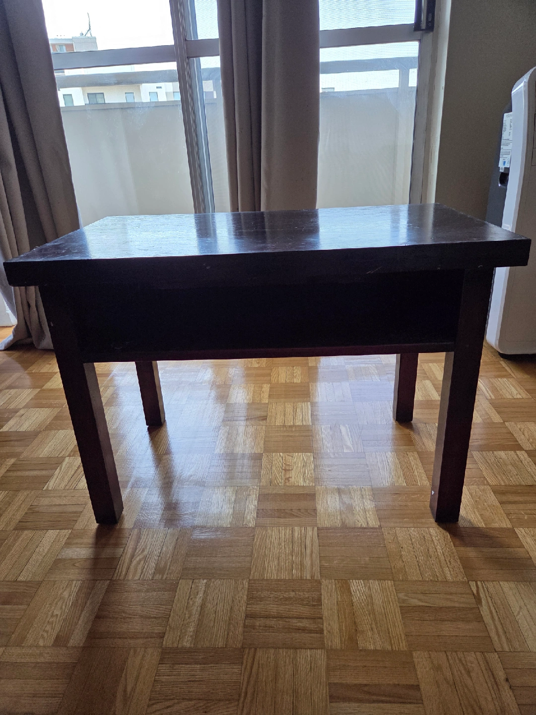 Selling a reddish dark brown solid wood table. It has some chips and scratches on the top surface, as shown in the pictures. It's a good table and would be great as a nightstand, coffee table or for a small space.