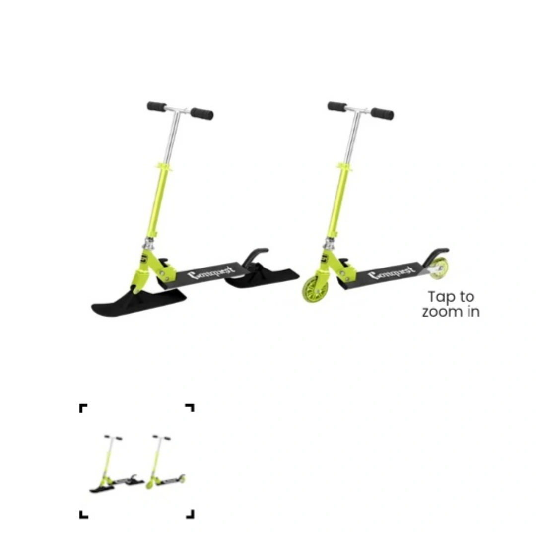 Two-in-one scooter and snow sled. black and silver metal frame. Easy to switch between modes. Great for kids. she's 5 and up can use till their older 3 adjustable sizes for all ages! super easy too fold and very compact to travel anywhere!