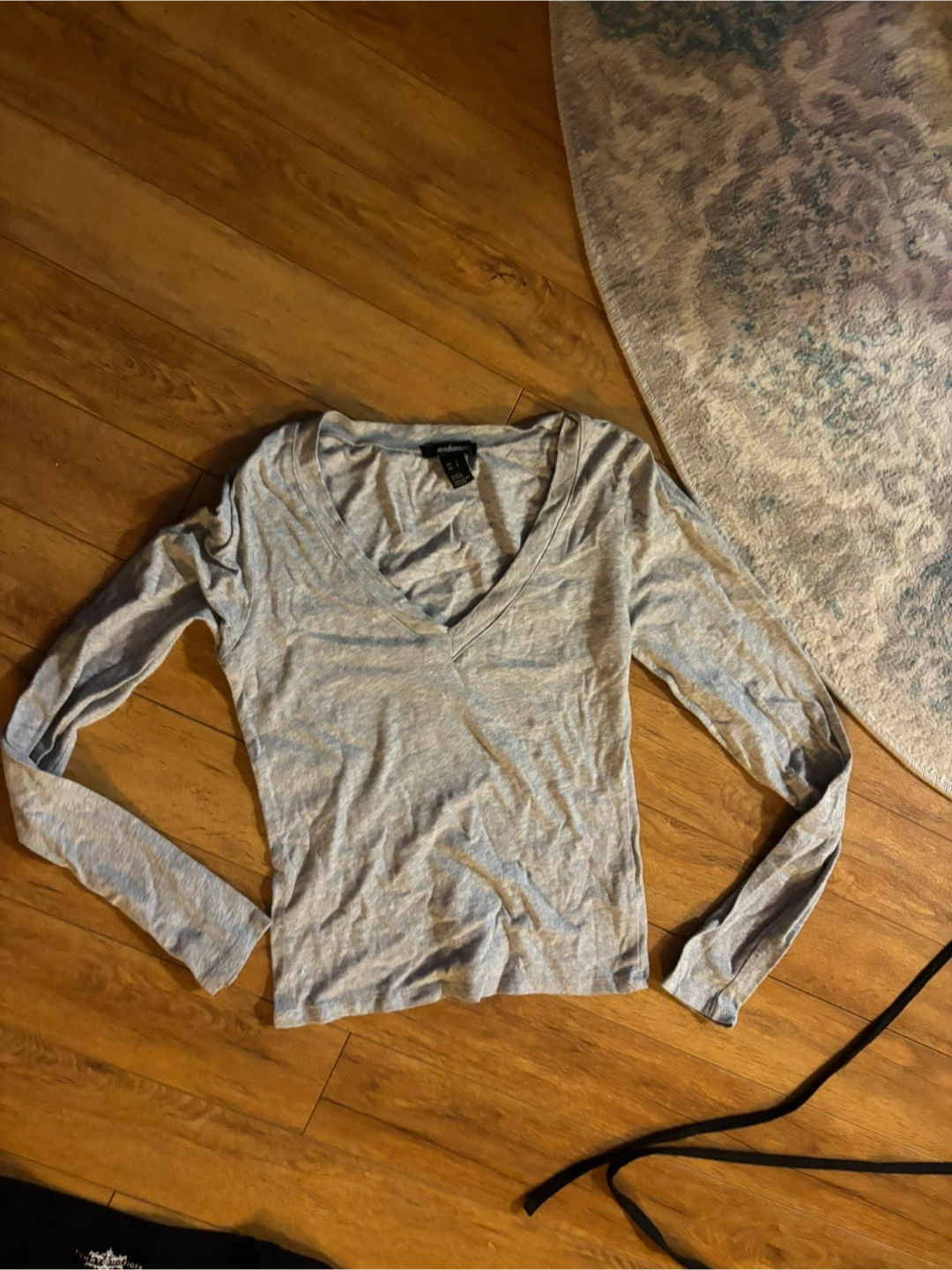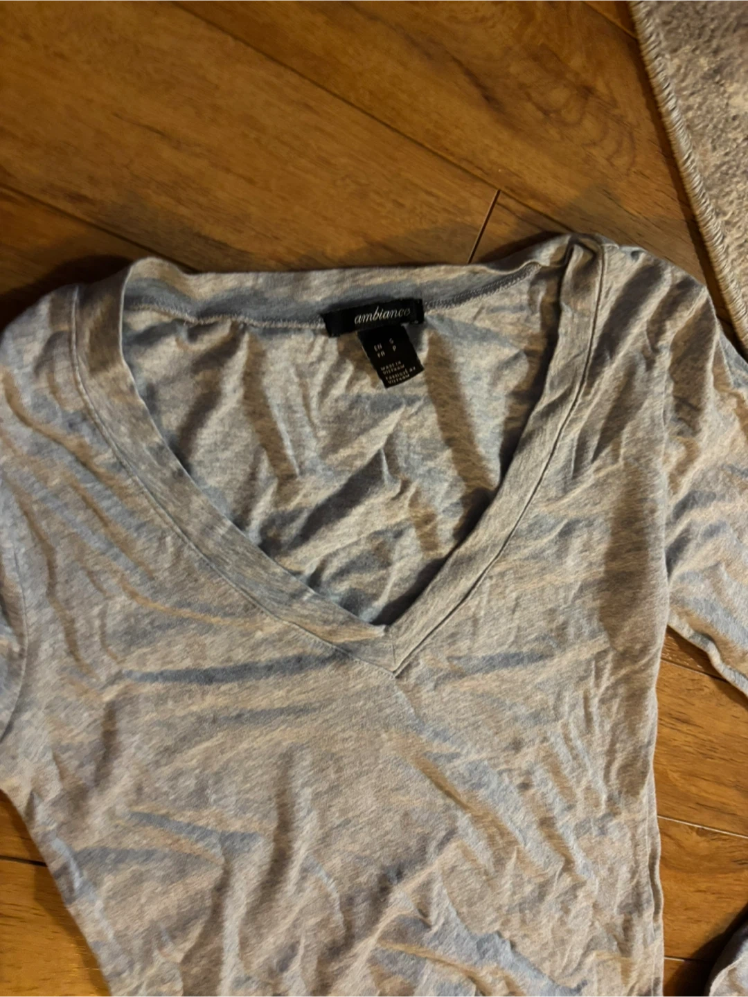 This is a grey V-neck long sleeve top. It's made of a soft, stretchy material. It's a versatile piece for layering or wearing on its own.