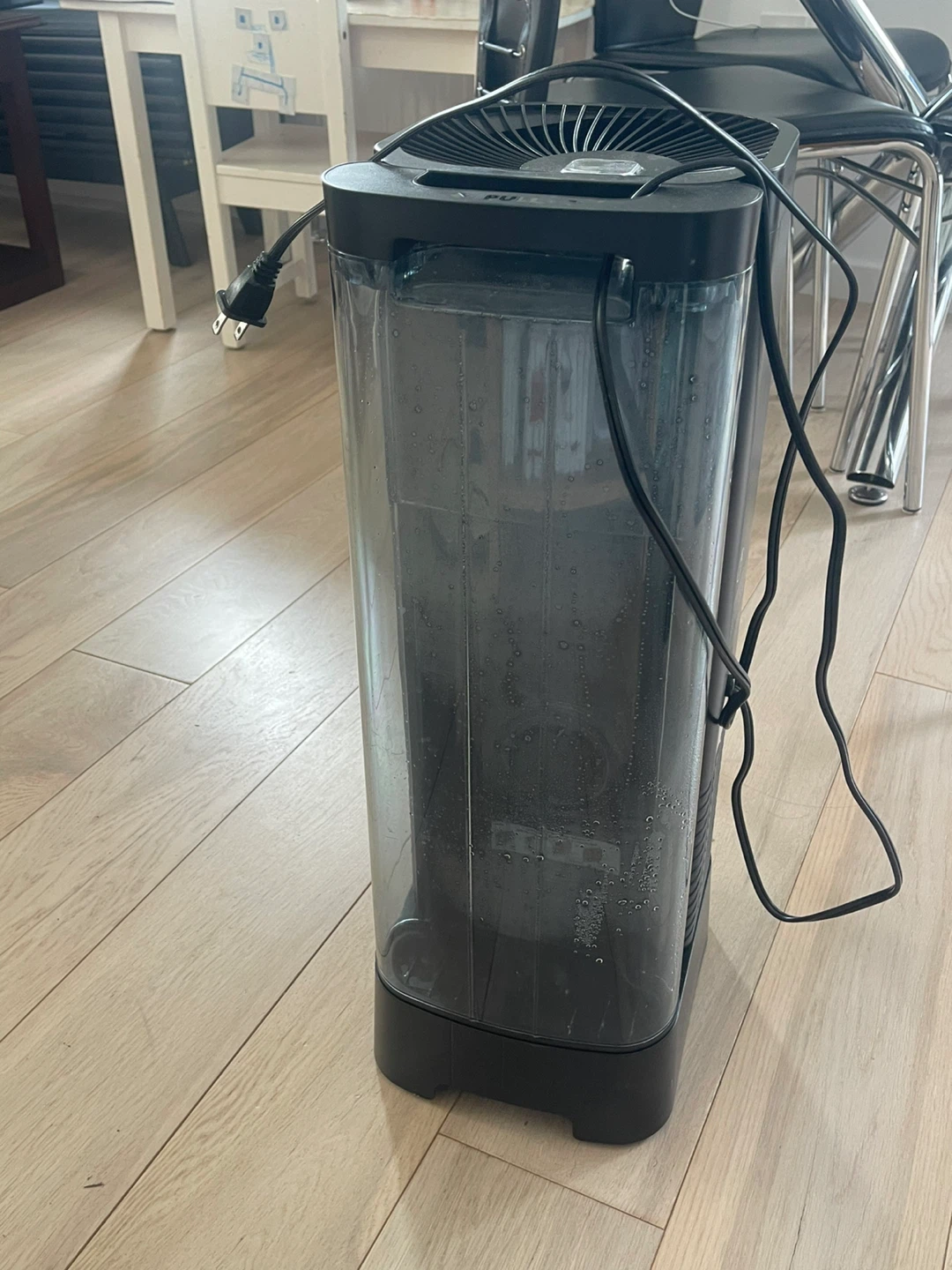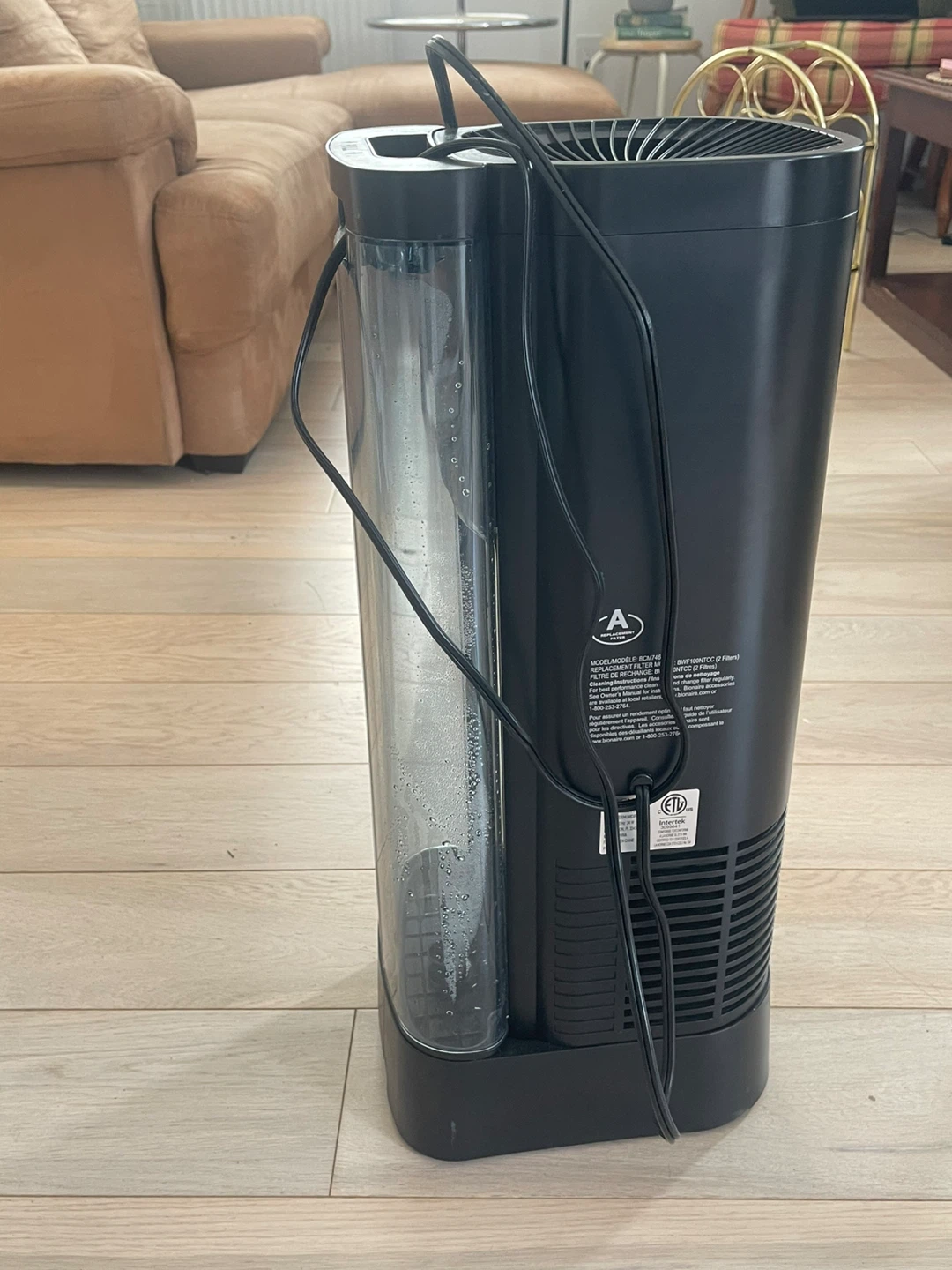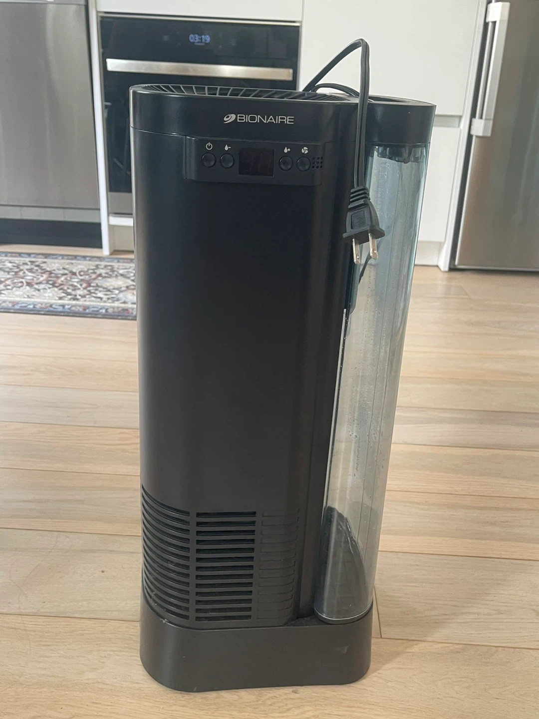 This Bionaire air purifier features multiple fan speeds and a tower design. It has a clear water tank. Works great for freshening up a room!