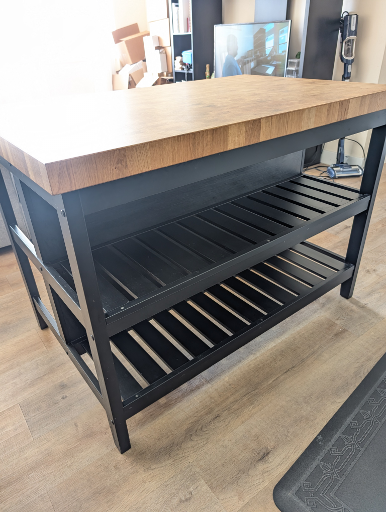 This kitchen island is a great addition to any home. two shelves, and a black finish. It is perfect for preparing food, serving meals, or simply adding extra counter space to your kitchen.