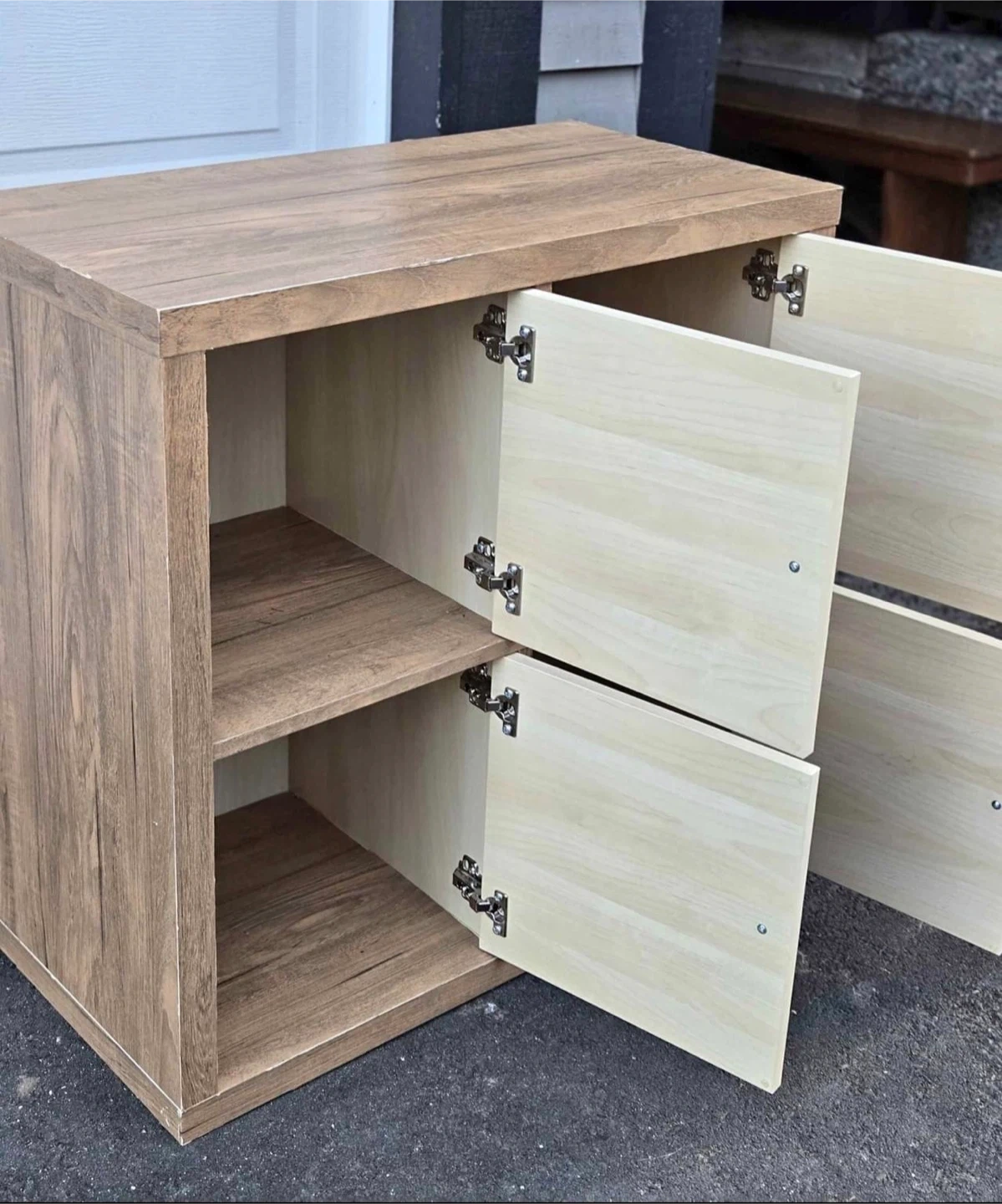 This is a compact wooden cabinet with four doors. It has two shelves inside for storage. Made from wood-like material.