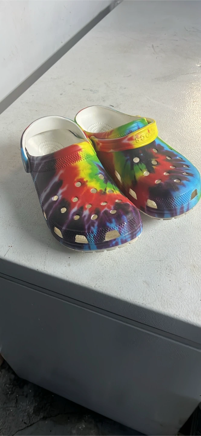 A pair of Crocs clogs with a colourful tie-dye pattern. These are made from Croslite material. They're comfy for everyday wear!