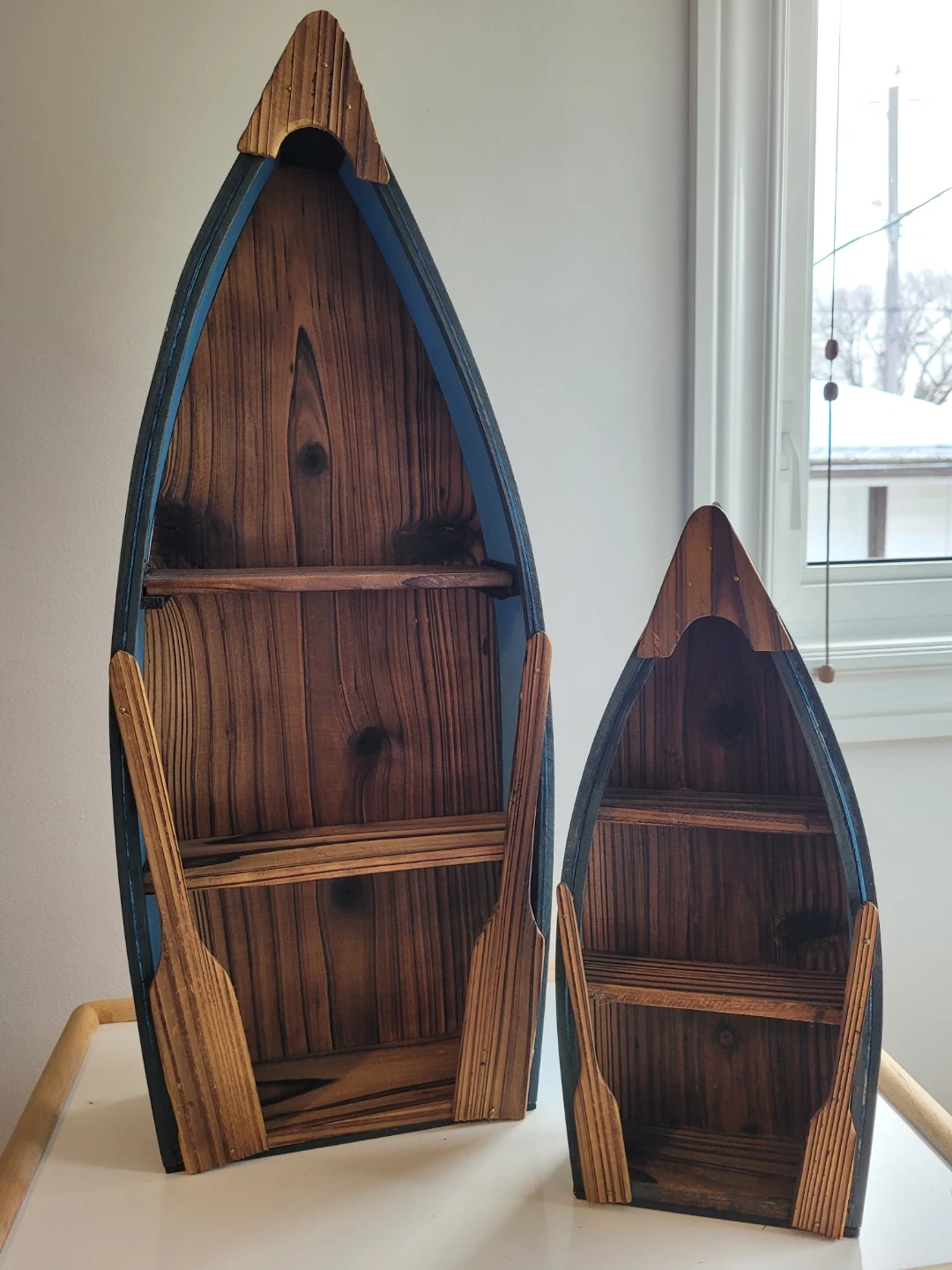 A set of two decorative wooden shelves shaped like canoes, complete with oars. These shelves are painted blue on the outside and feature natural wood interiors. They're perfect for adding a nautical touch to your home decor.