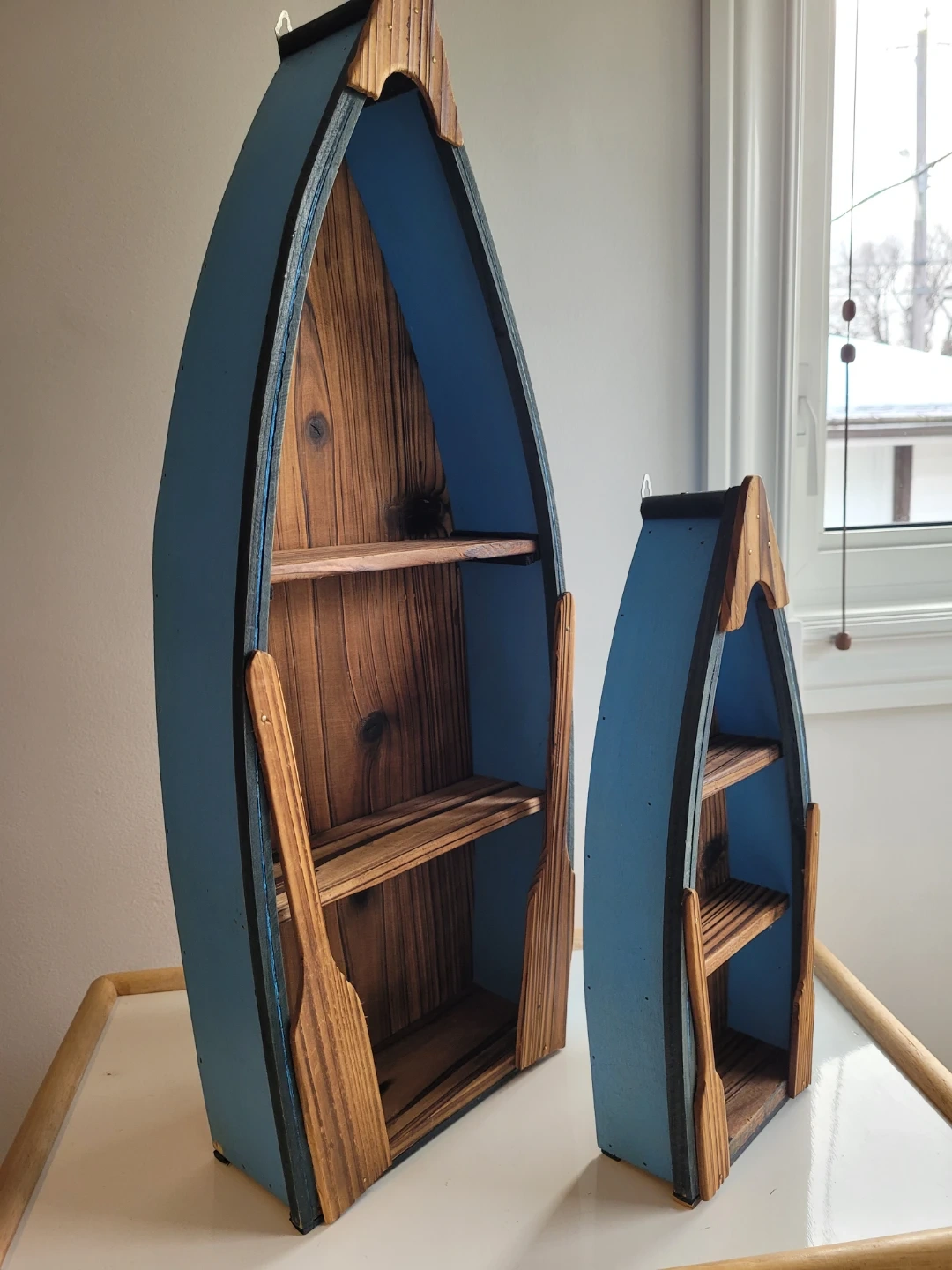 A set of two decorative wooden shelves shaped like canoes, complete with oars. These shelves are painted blue on the outside and feature natural wood interiors. They're perfect for adding a nautical touch to your home decor.