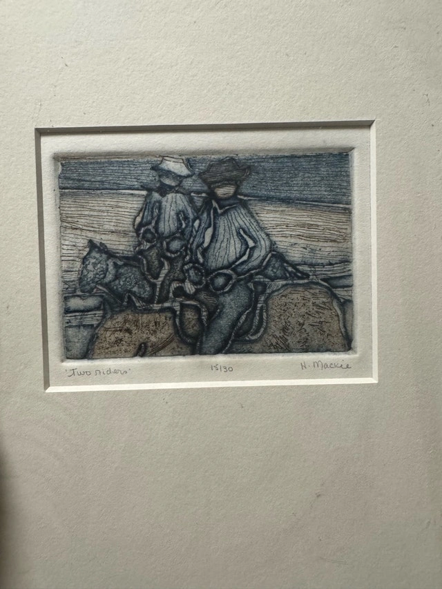 This is a charming, framed H. Mackie print, titled 'Two Riders,' numbered 15/30. It was acquired from the Lamm Art Gallery in Calgary. As a used item, it carries a history and a unique character. Embrace the opportunity to own a piece that tells a story. If the ad is up, it's still available!