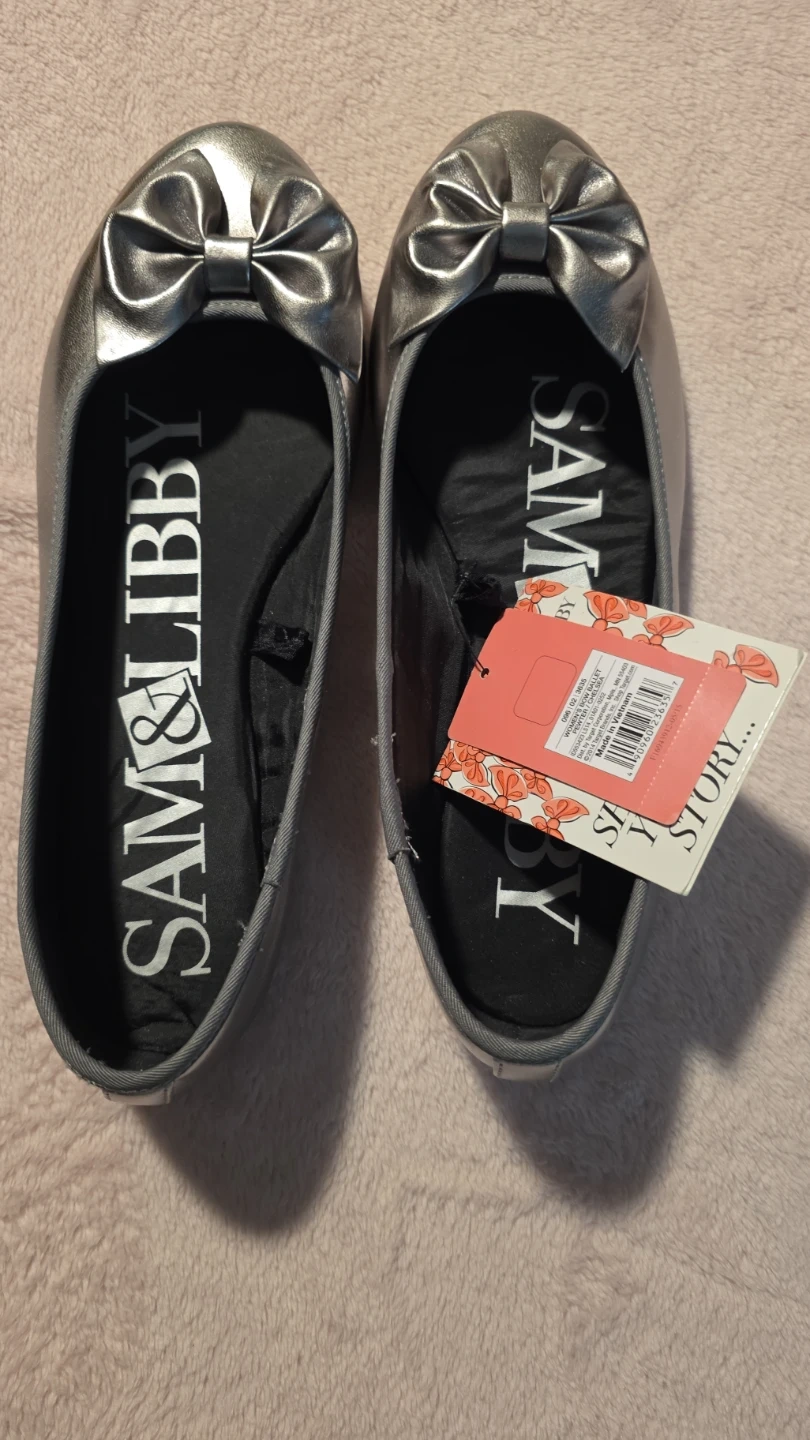 Silver ballet flats from Sam & Libby. These shoes feature a decorative bow on the toe. Very comfy and cushioned inner sole. Great for everyday wear!