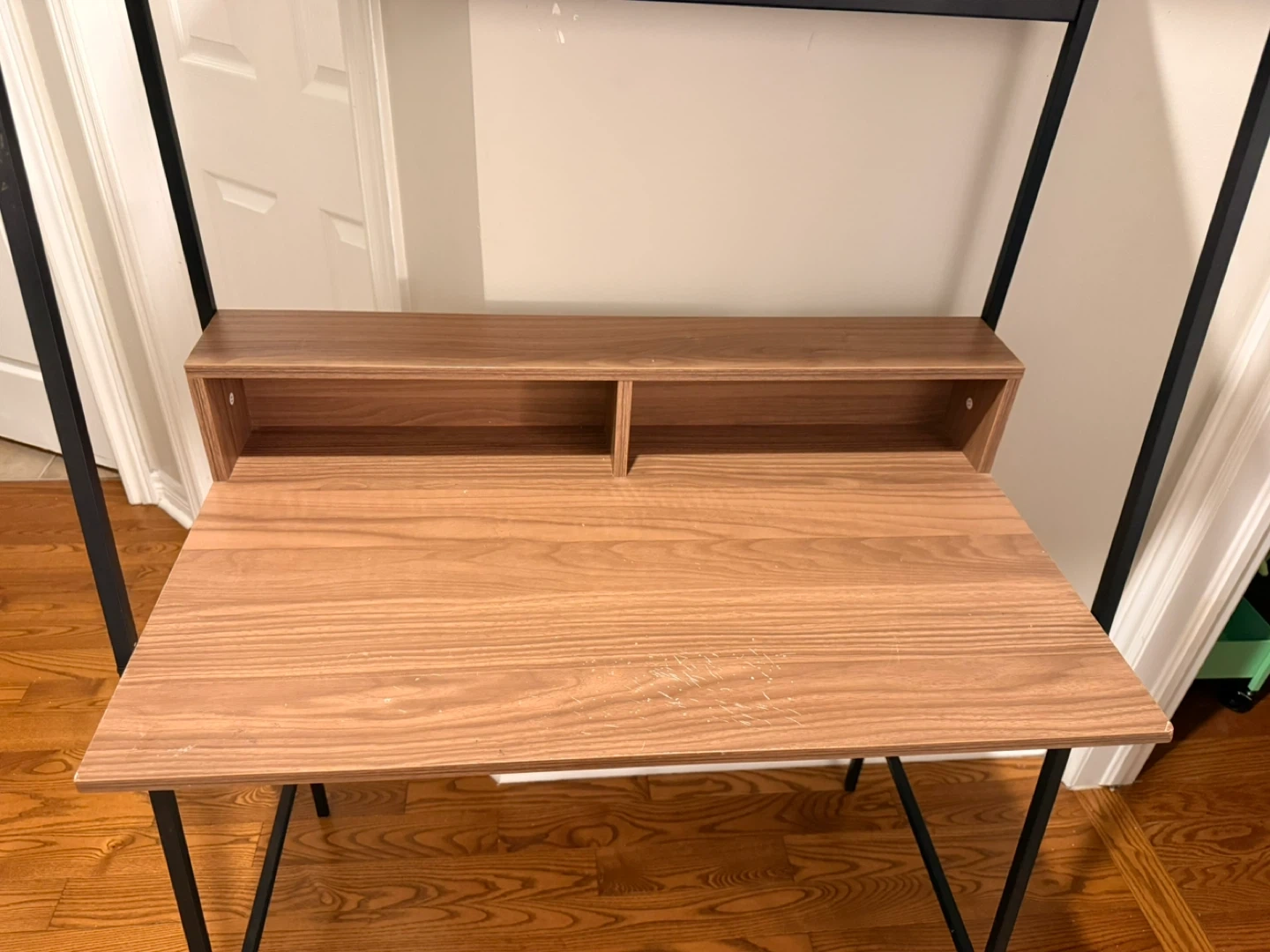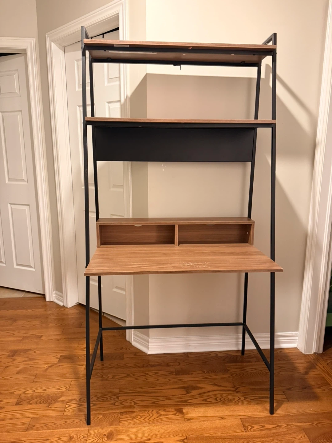 Selling a modern ladder desk with a wood finish and black metal frame. It's perfect for small spaces and adds a touch of style to any room. Great for a home office or study area!