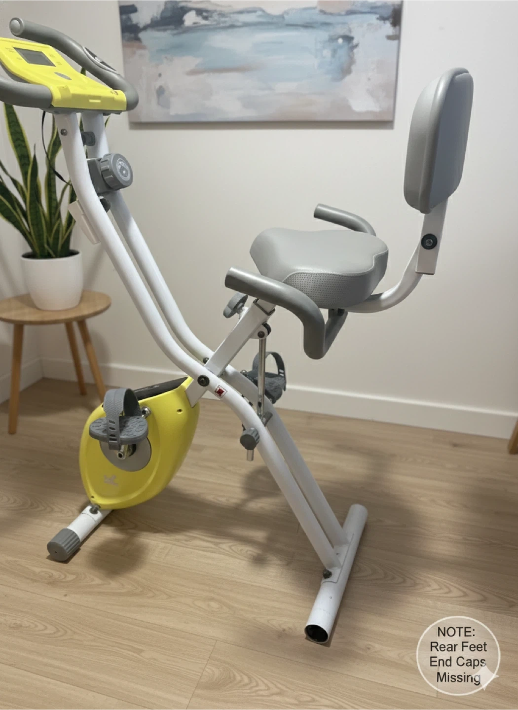 Note: The rear plastic feet are missing, but this does not affect the bike’s balance or movement at all. It has been tested and is fully functional. The bike folds and is transported on its front wheels. You can see the rear feet area in the photos. Please be aware of this before purchasing.