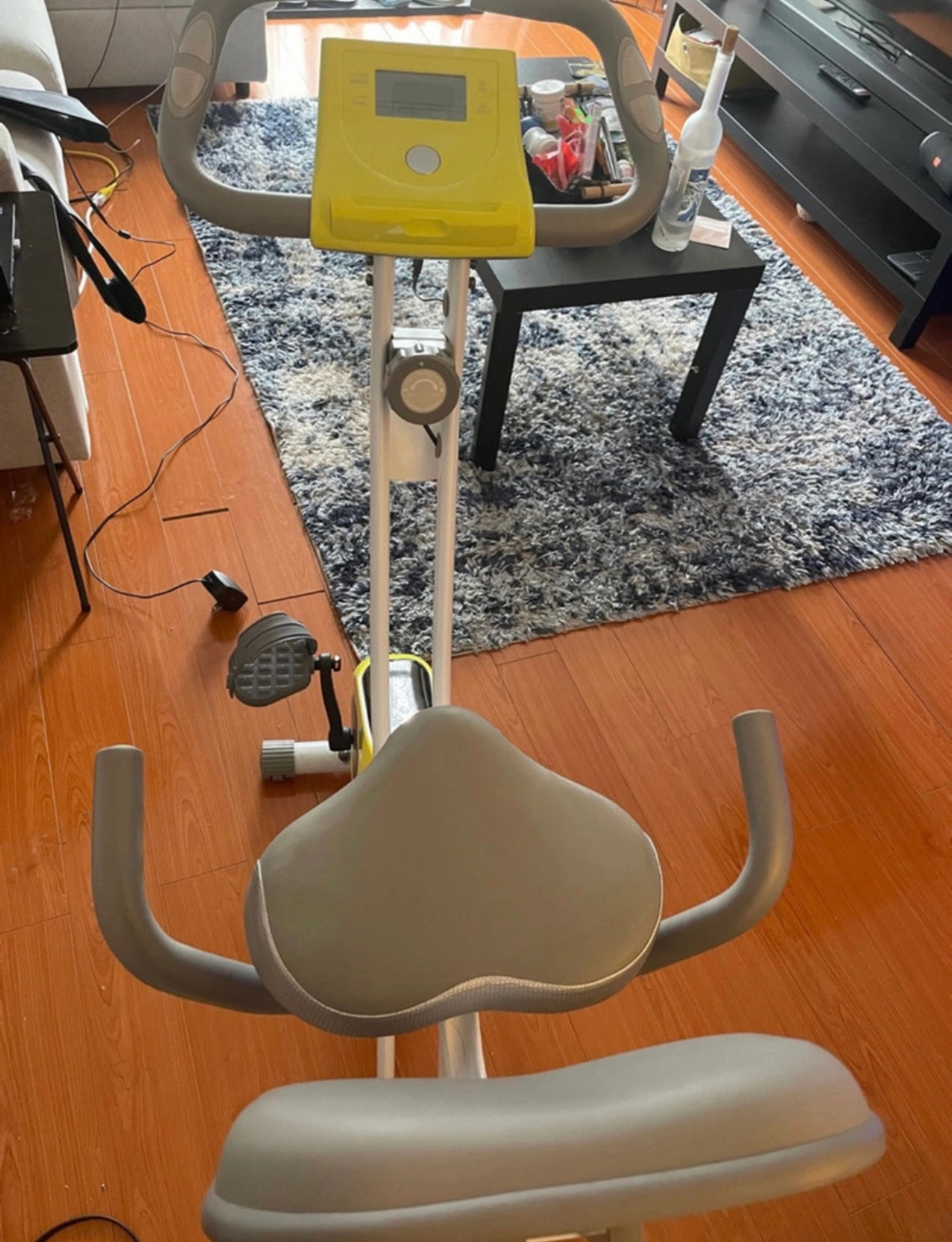 Note: The rear plastic feet are missing, but this does not affect the bike’s balance or movement at all. It has been tested and is fully functional. The bike folds and is transported on its front wheels. You can see the rear feet area in the photos. Please be aware of this before purchasing.
