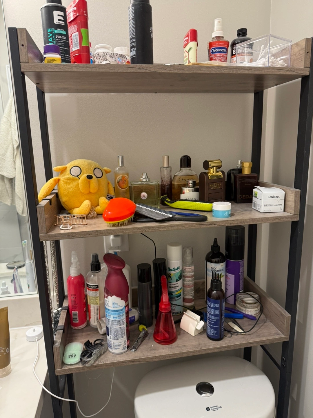 Slim, three-shelf organizer. Great for toiletries, accessories, or other small items. Metal frame, wood shelves. Measures approximately 63cm high, 25cm wide, and 165cm long.