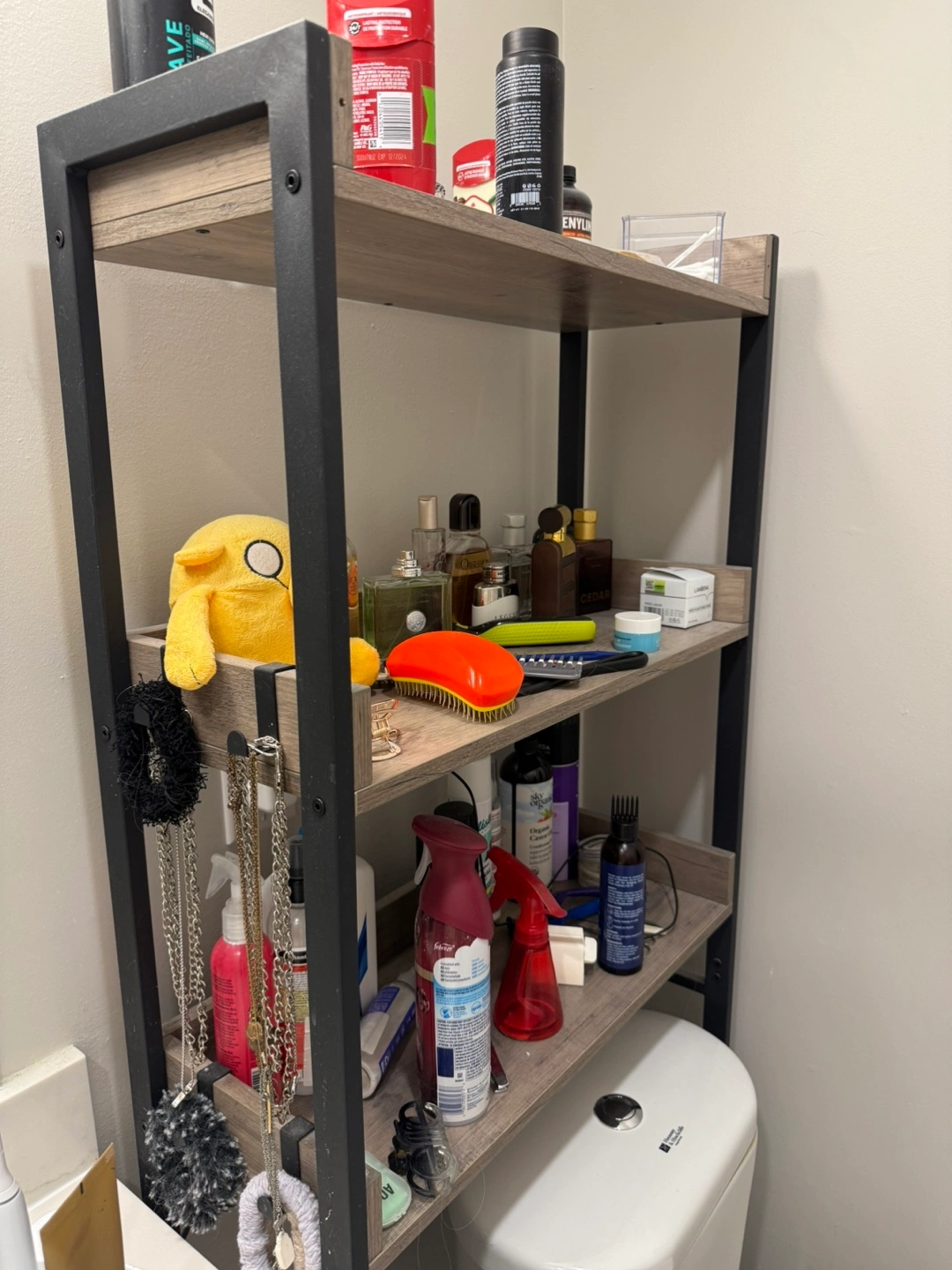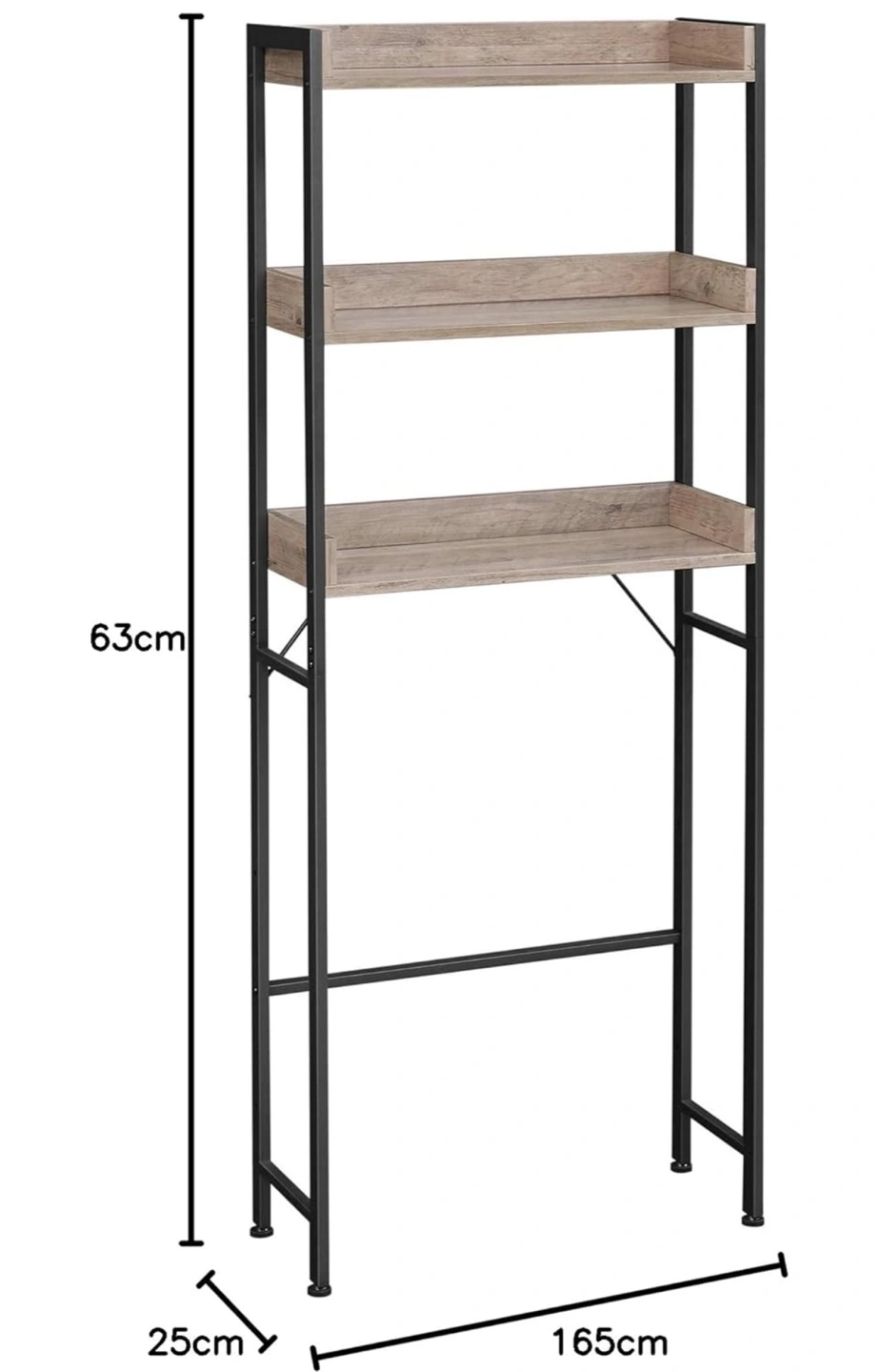 Slim, three-shelf organizer. Great for toiletries, accessories, or other small items. Metal frame, wood shelves. Measures approximately 63cm high, 25cm wide, and 165cm long.