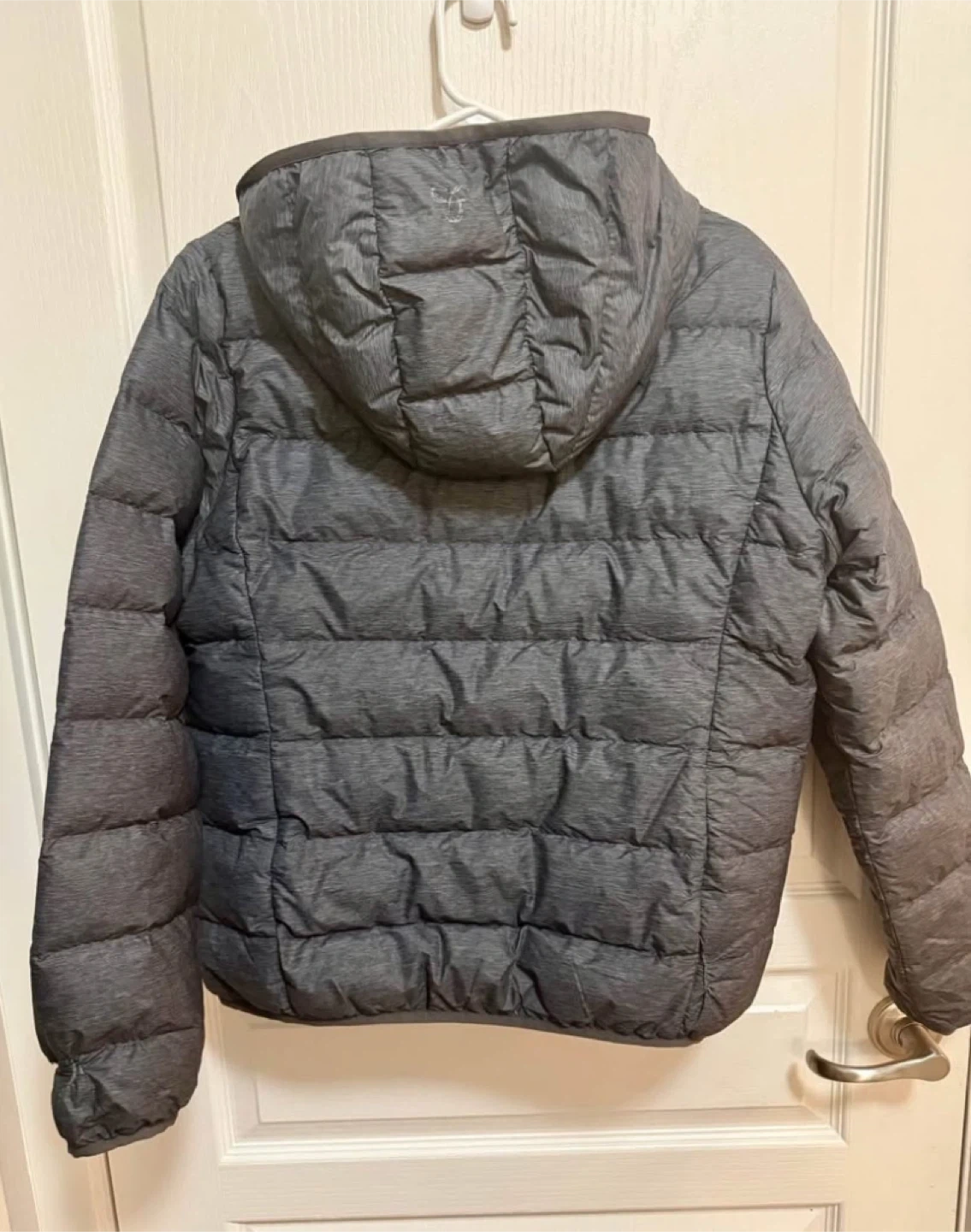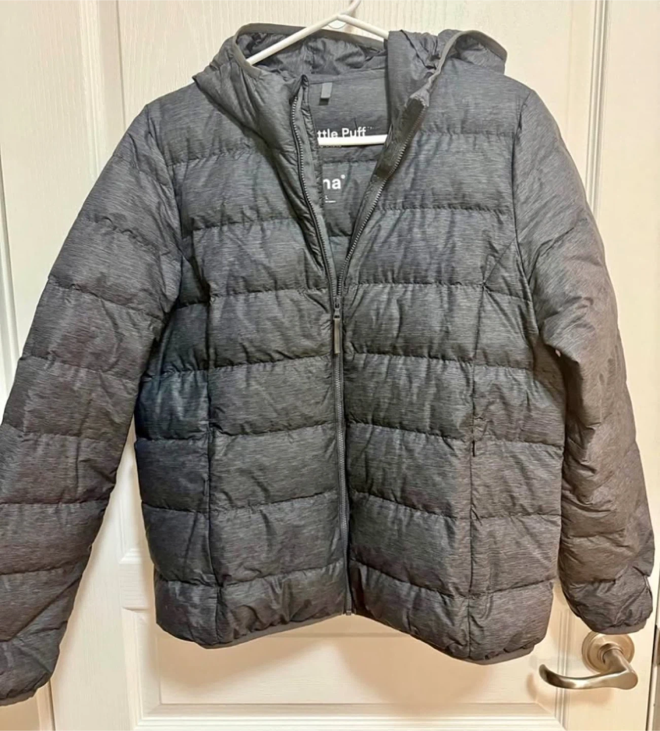 It's a packable puffer coat with a hood. Outer shell and lining are 100% nylon, and fill is 90% down, 10% feathers. It's a great layering piece for cooler weather!