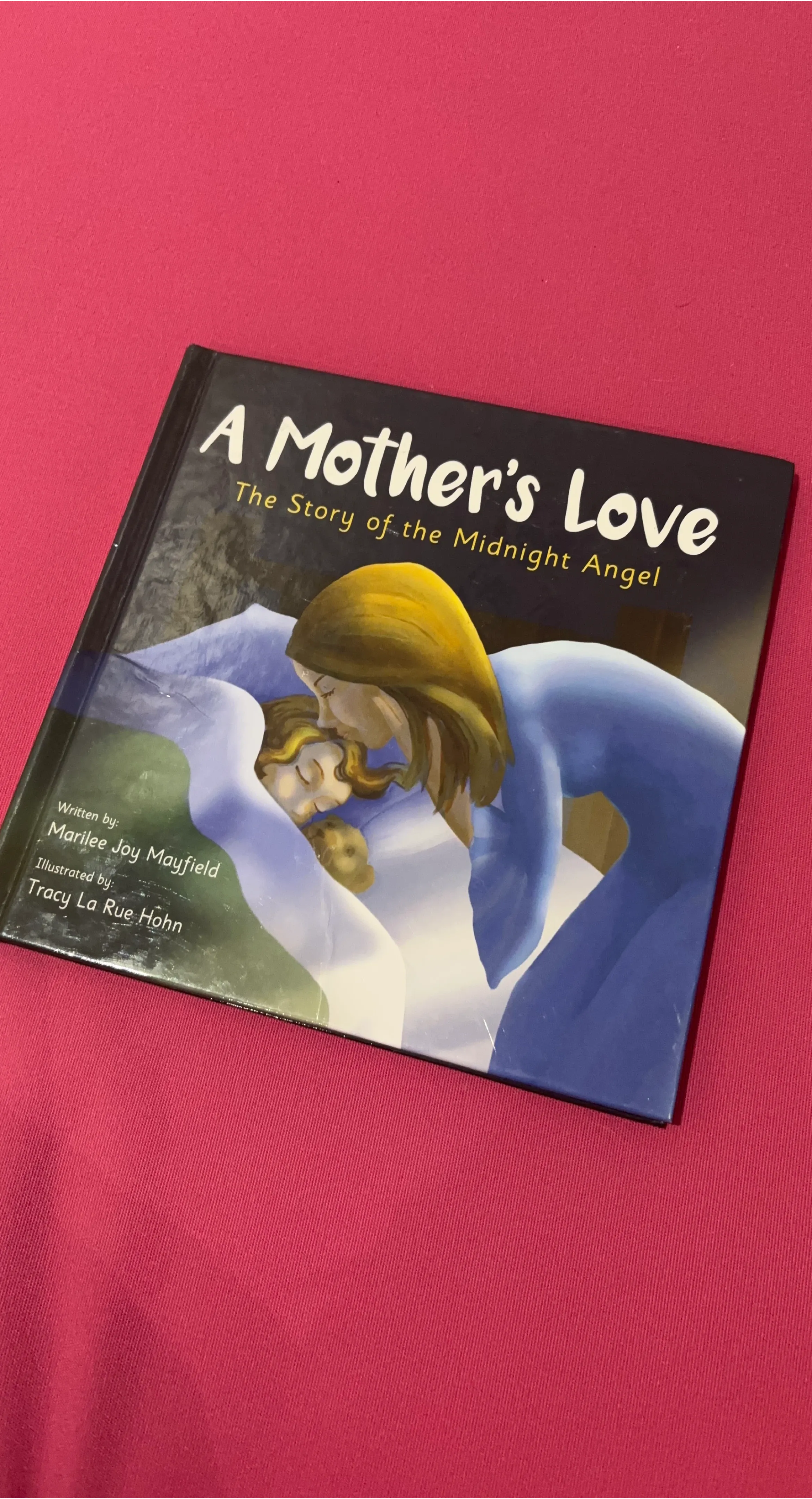 This book is titled "A Mother's Love: The Story of the Midnight Angel." It's written by Marilee Joy Mayfield and illustrated by Tracy La Rue Hohn. This heartwarming story explores the deep bond between a mother and child.