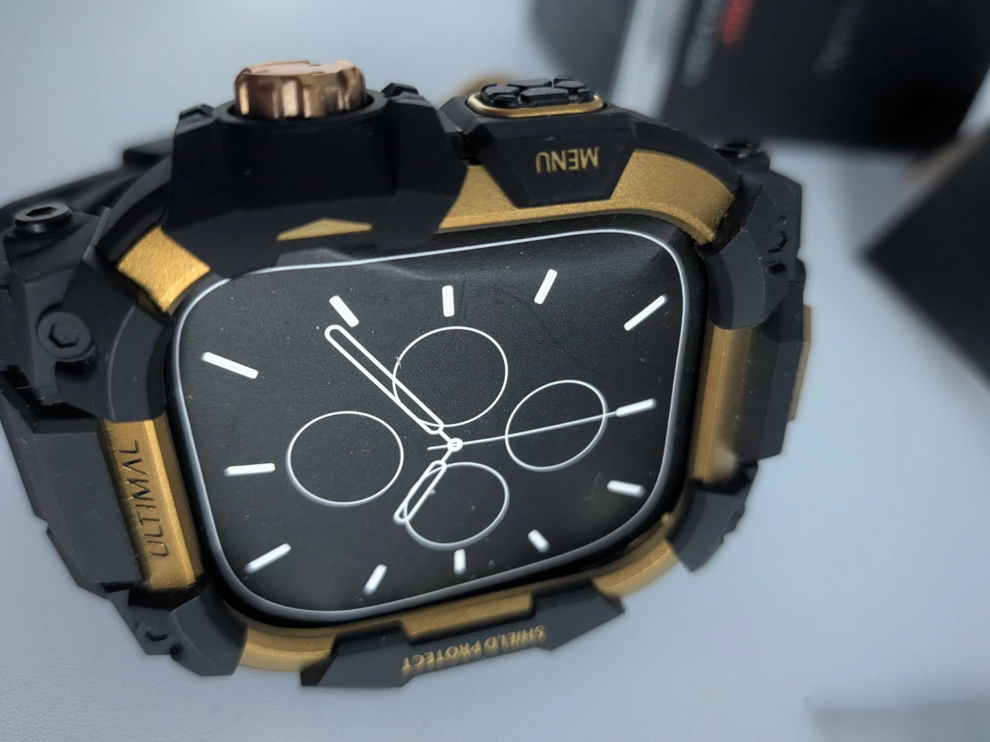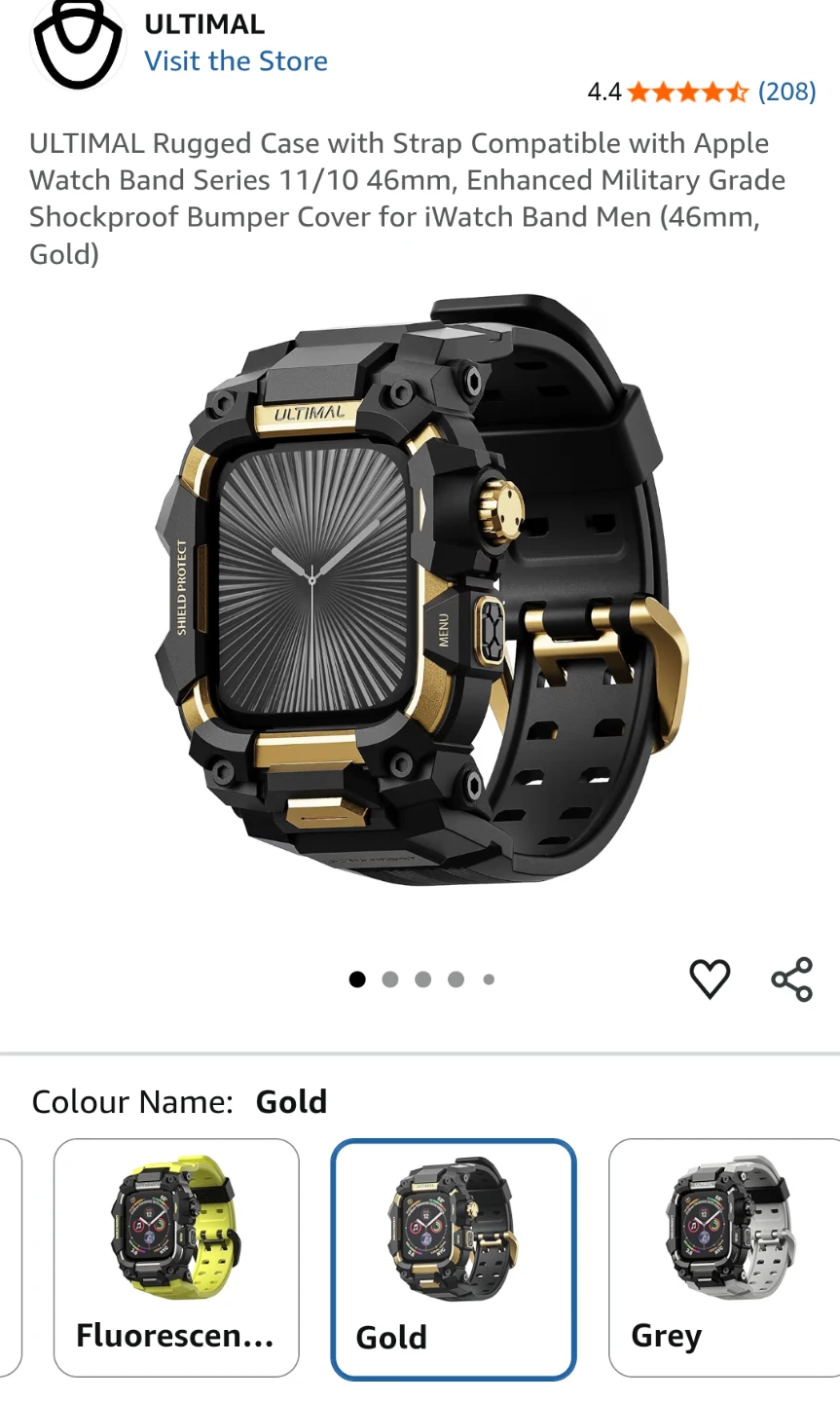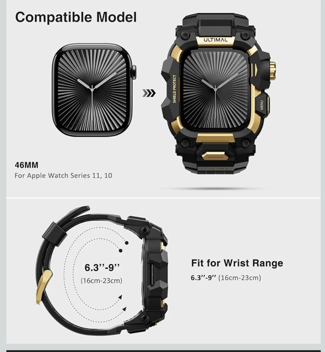 ULTIMAL rugged band case compatible with Apple Watch Series 10 and 11, 46mm. It's an enhanced military-grade shockproof bumper cover. Fits wrist range 6.3"-9".