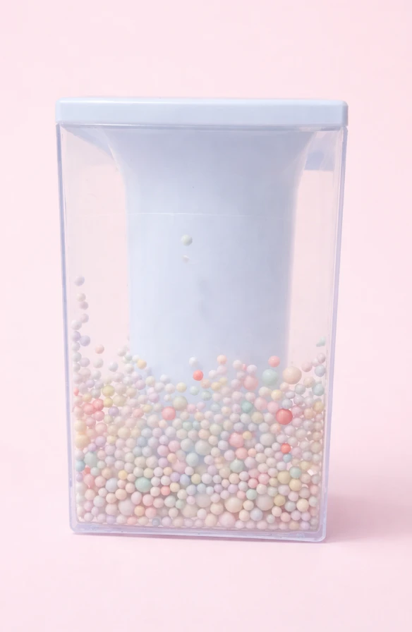 This unique desk organizer has a light blue square shape. It's filled with colourful, small beads that move around. Great for small items on a desk!