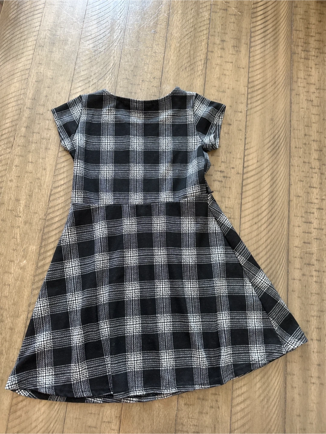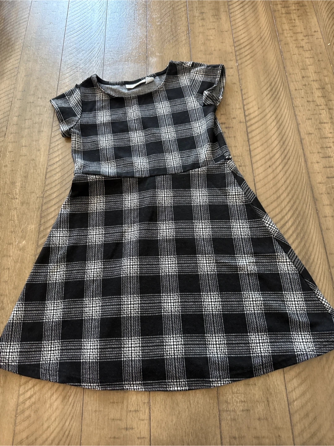 This is a girls' short-sleeve dress with a black and white plaid pattern. It features a classic A-line silhouette with a gathered waist. The fabric feels soft and stretchy.