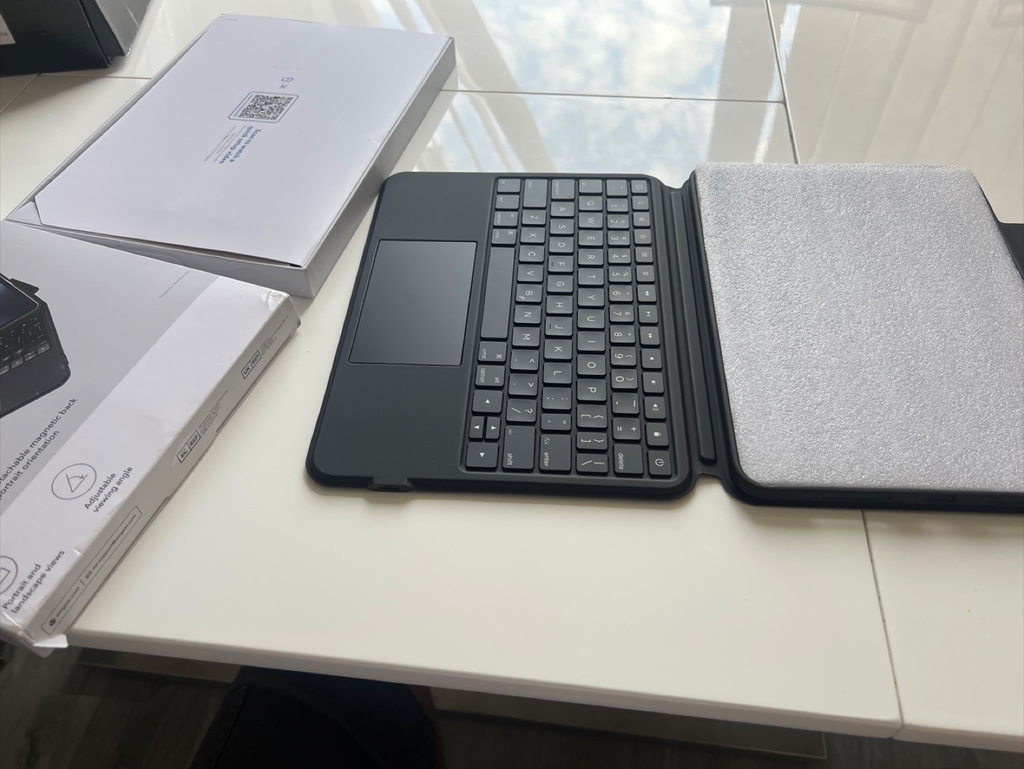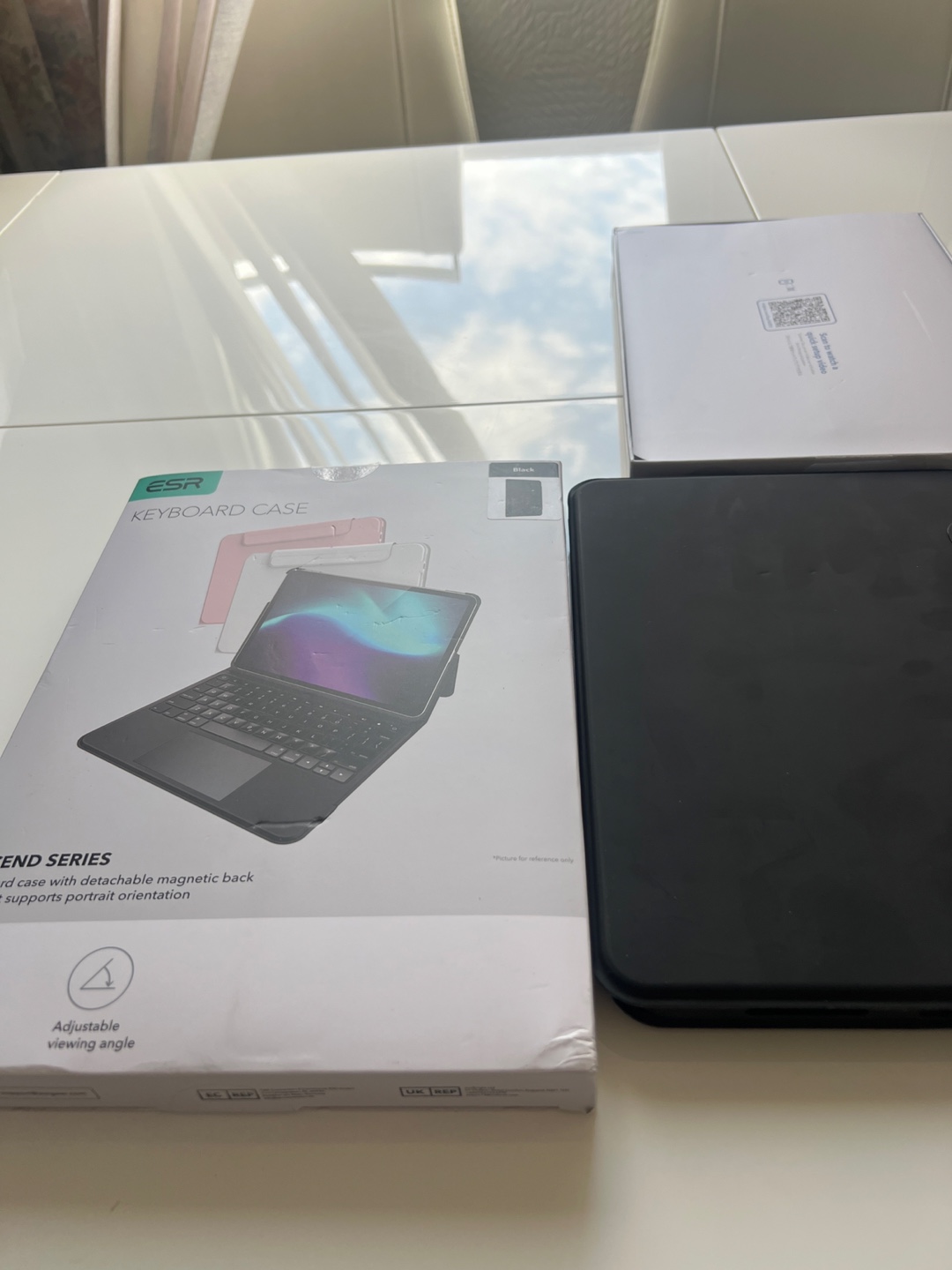 Selling an ESR Rebound Magnetic Keyboard Case for iPad. It comes with a detachable magnetic back cover that supports portrait orientation and adjustable viewing angles. The box is included!