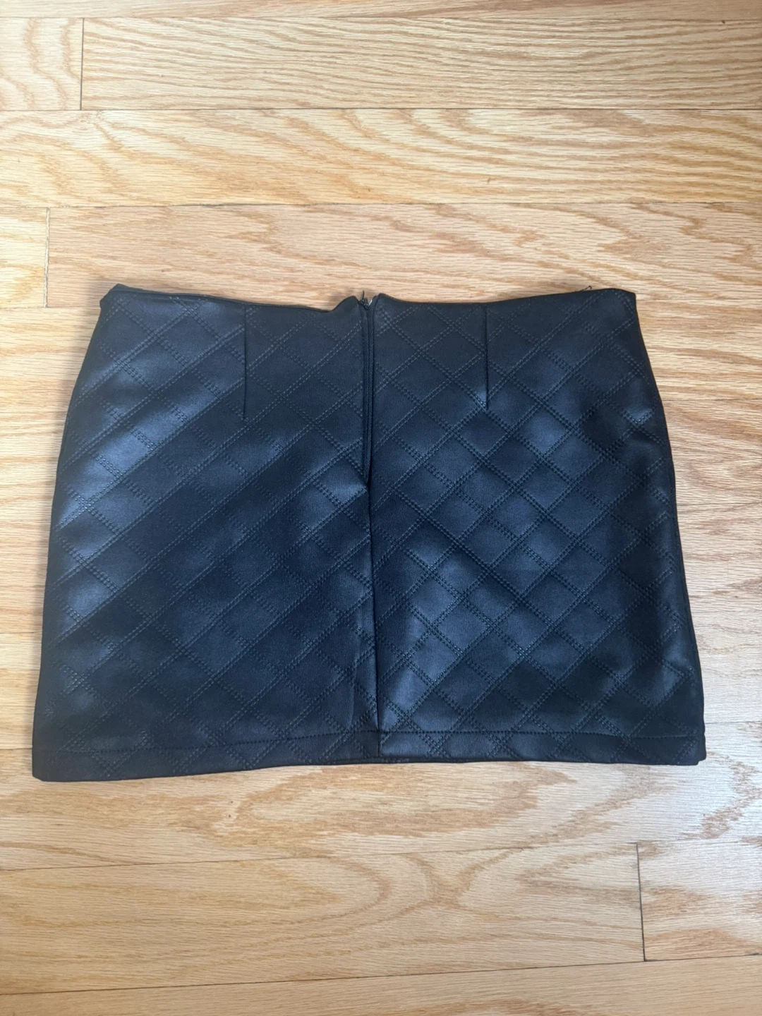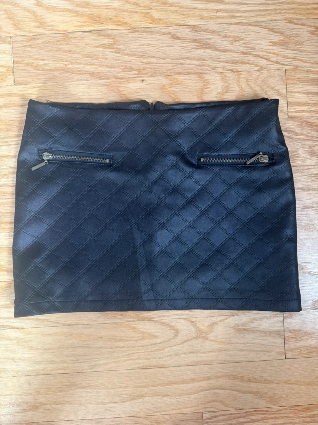 This black mini skirt features a quilted faux leather material. It has a zipper closure and two decorative zip pockets on the front. The back has a smooth finish. It's a stylish piece for many occasions!