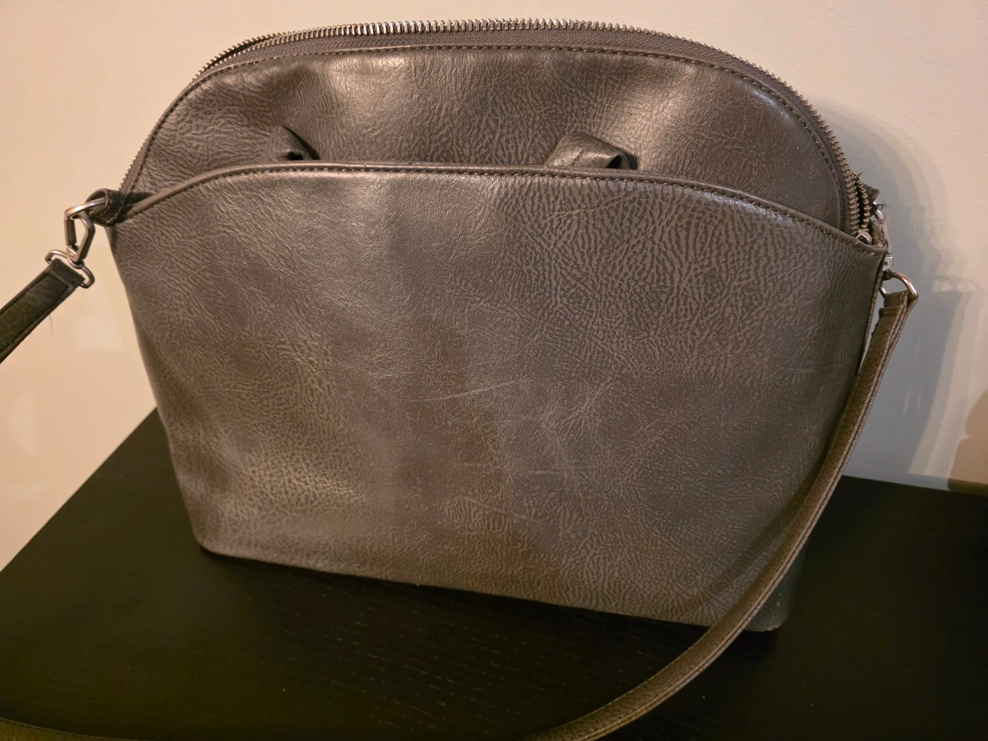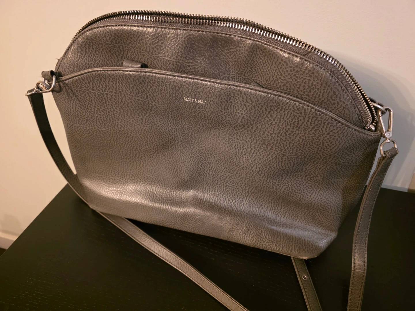 Matt & Nat dome crossbody bag in a grey faux leather material. It has a zip-top closure and an exterior slip pocket. Adjustable crossbody strap.
