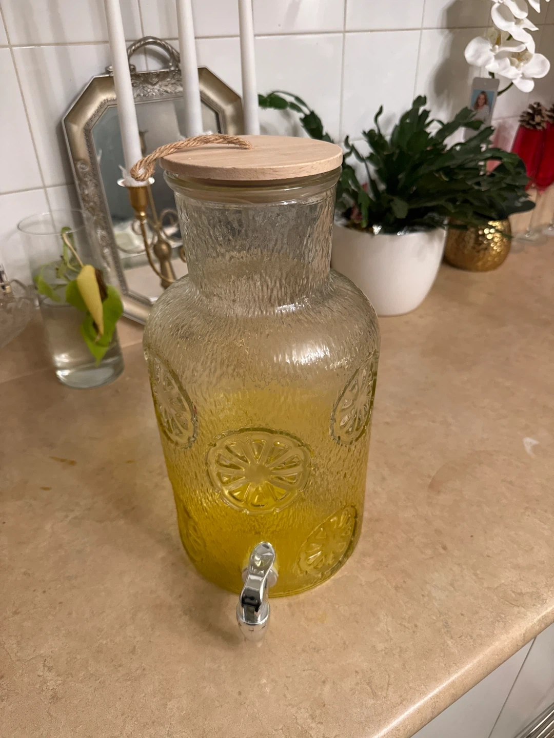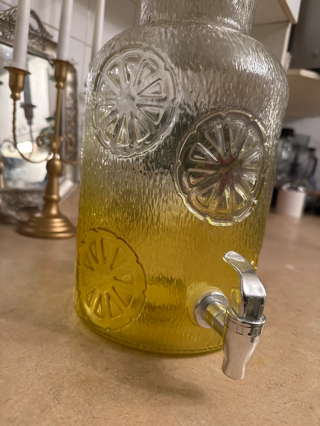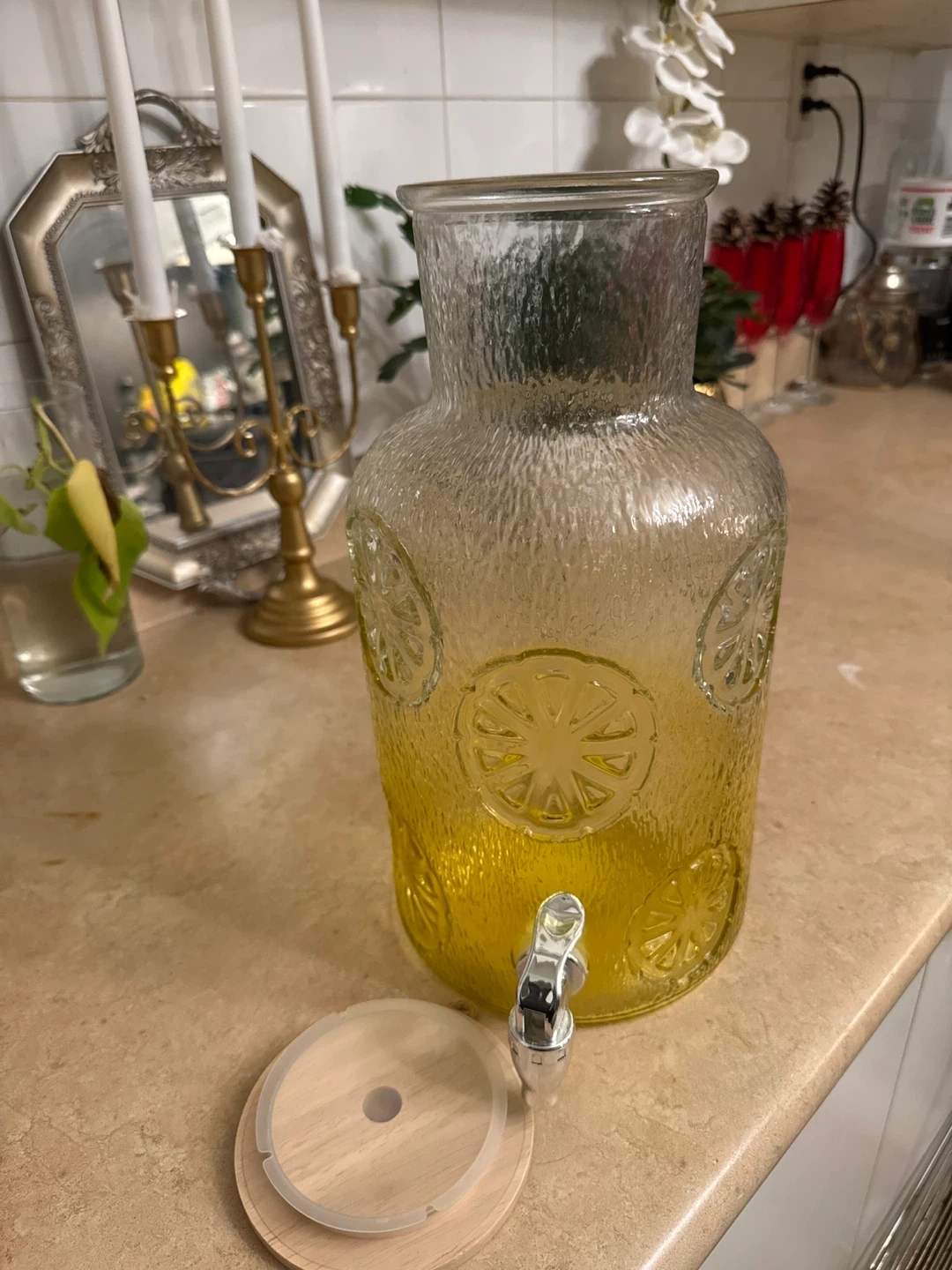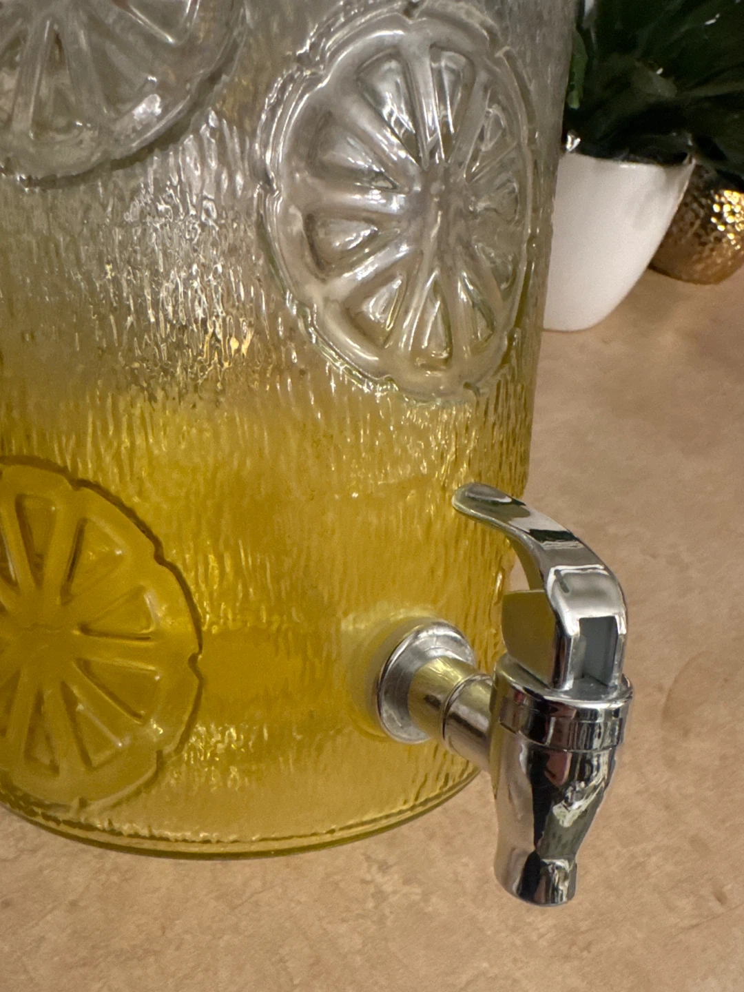This textured glass beverage dispenser is perfect for parties and gatherings. It has a wooden lid and a metal spigot for easy pouring. The textured surface with embossed citrus designs adds a decorative touch to any event. Holds a generous amount of your favourite drinks!