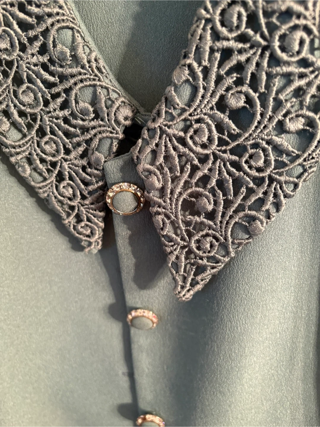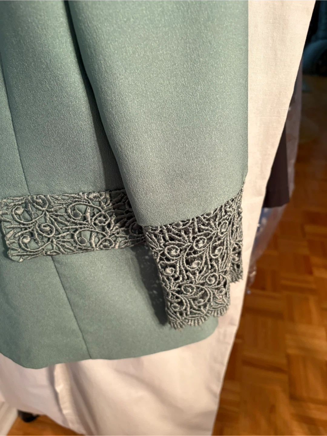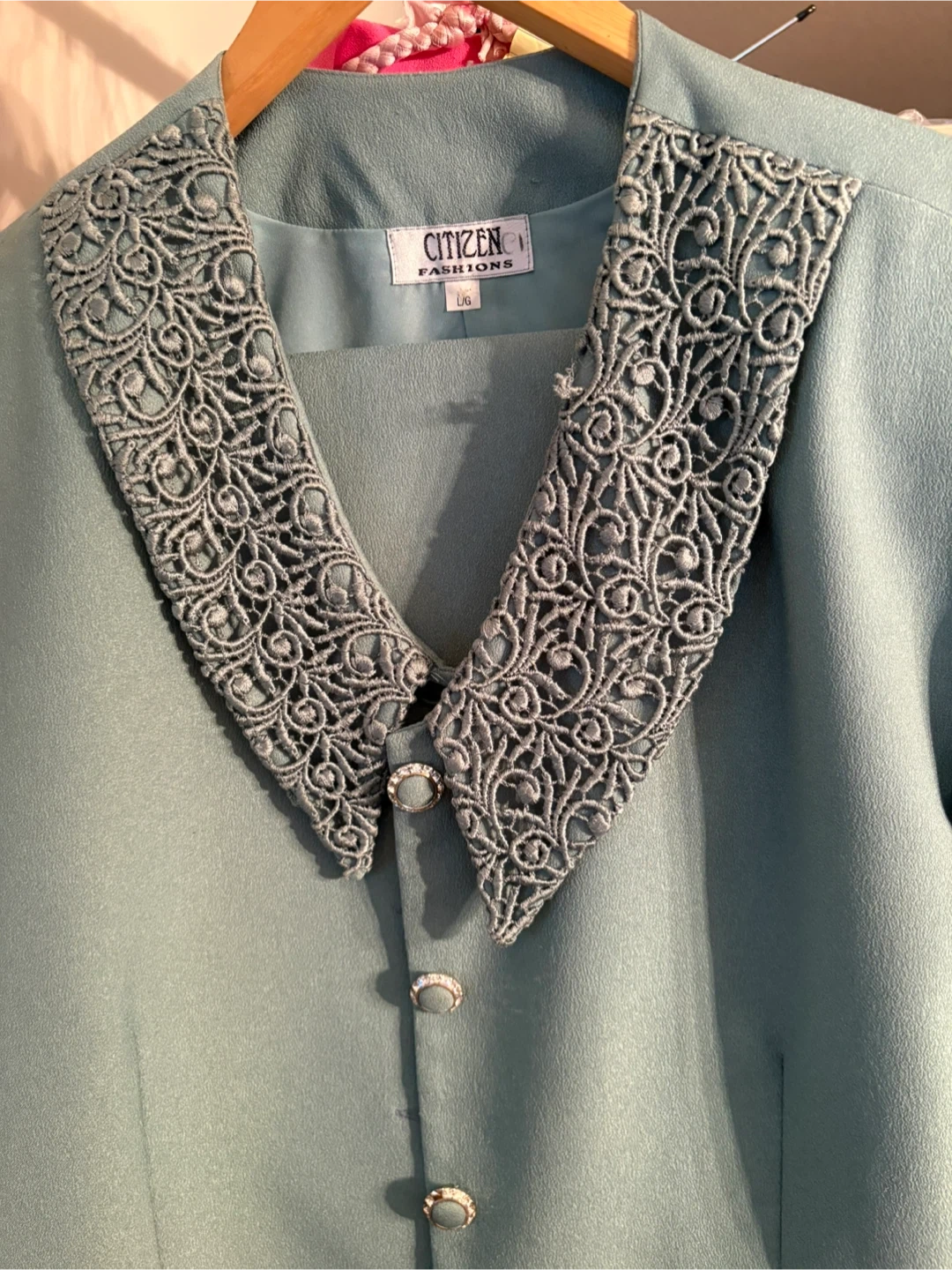 Light blue suit from Citizen Fashions in size large. It features intricate lace detailing on the collar and cuffs. Includes decorative button accents. worn once at wedding.