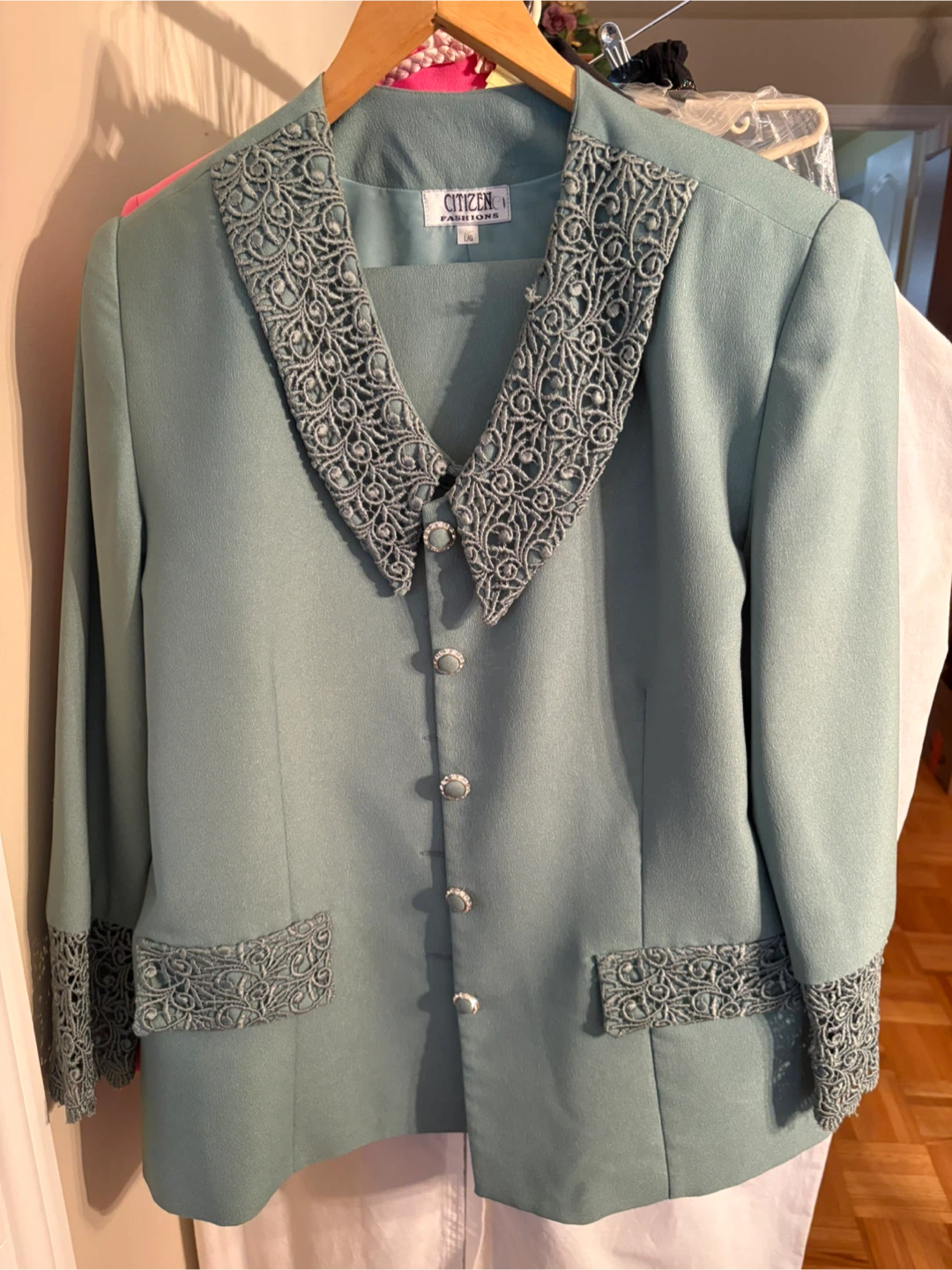 Light blue suit from Citizen Fashions in size large. It features intricate lace detailing on the collar and cuffs. Includes decorative button accents. worn once at wedding.