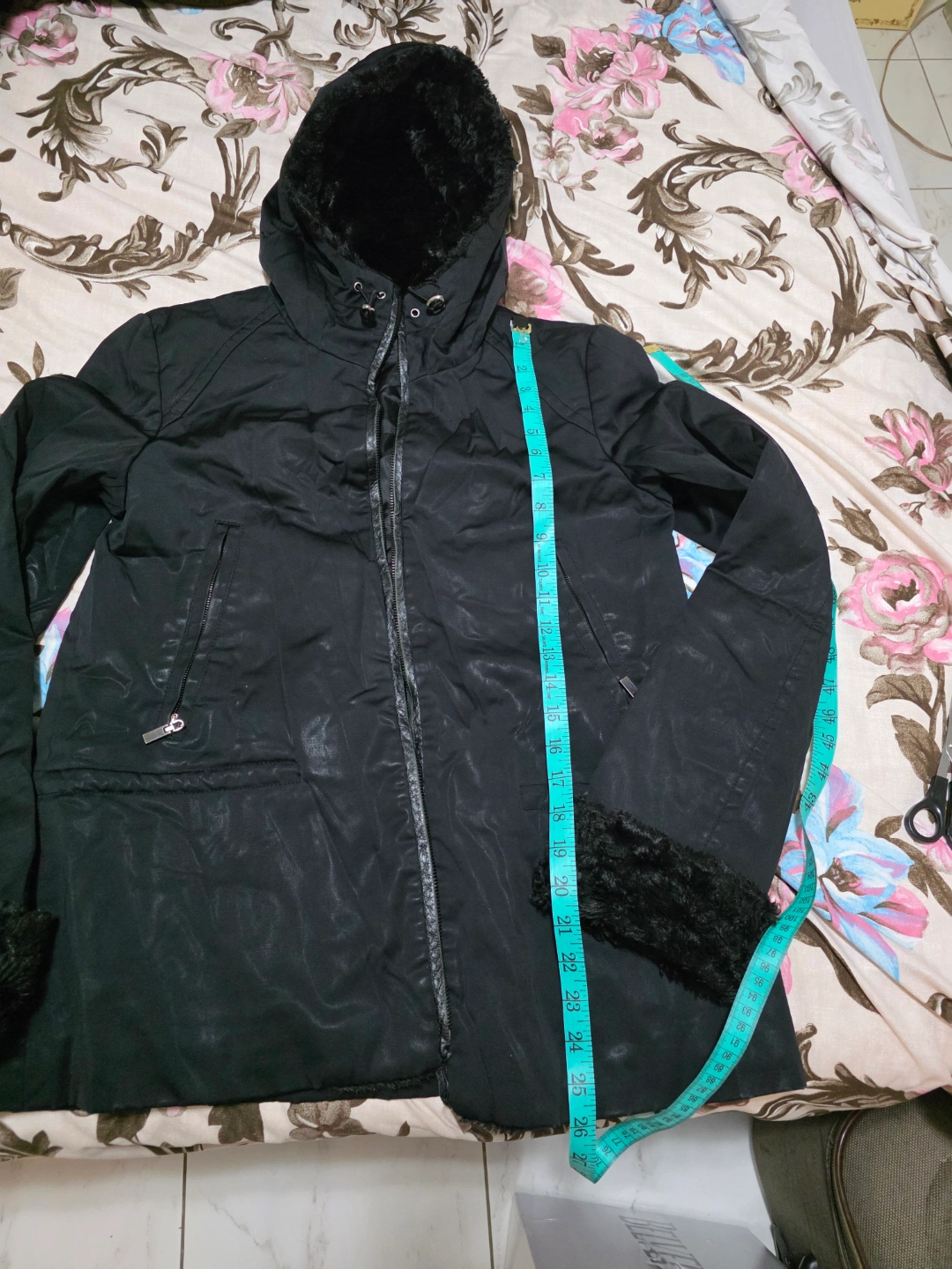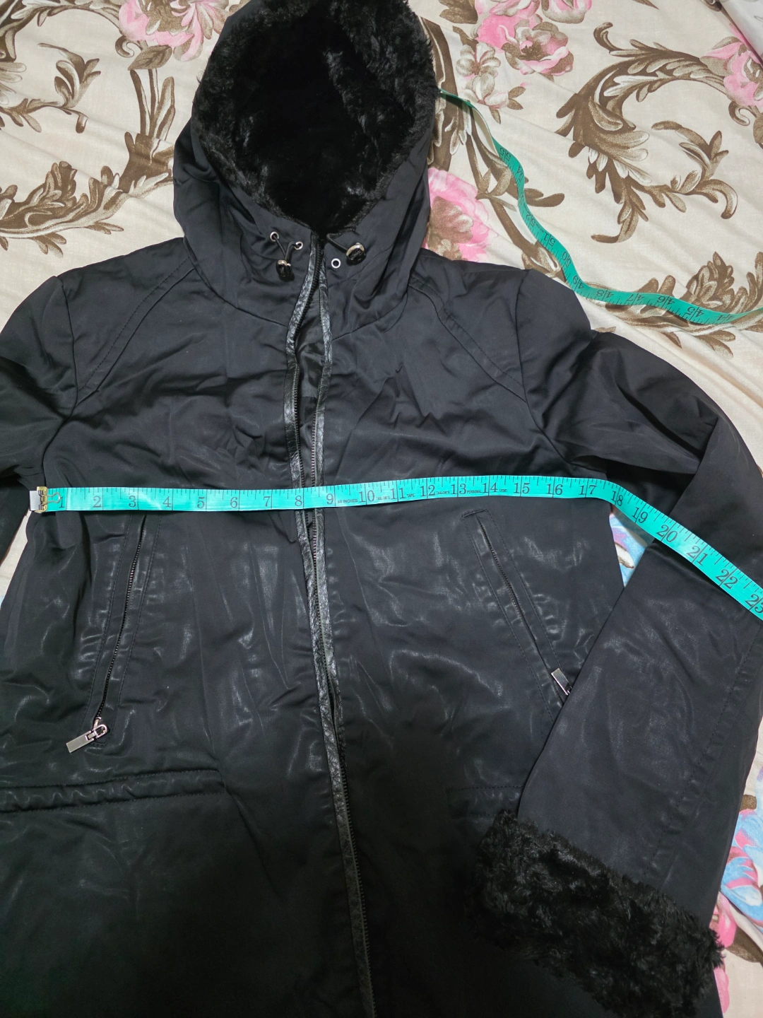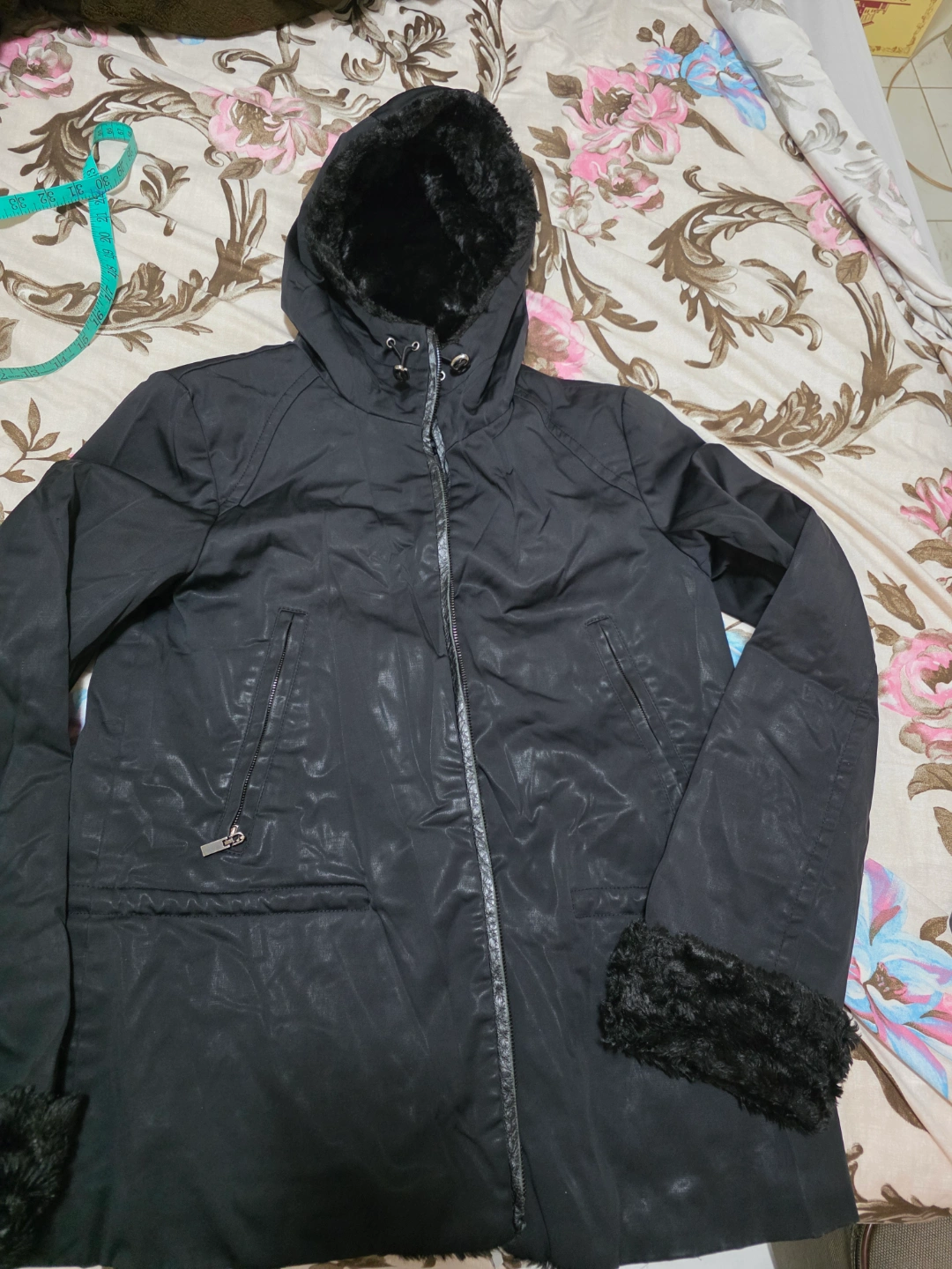 Warm winter jacket. Features a black, faux fur lined hood and cuffs. Zipper closure. Two front pockets. Looks great with jeans or leggings.