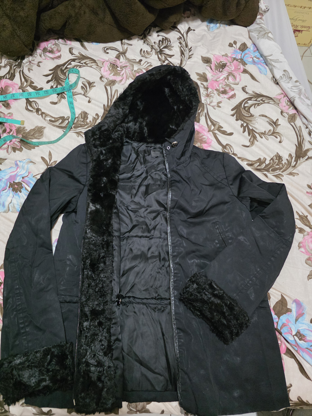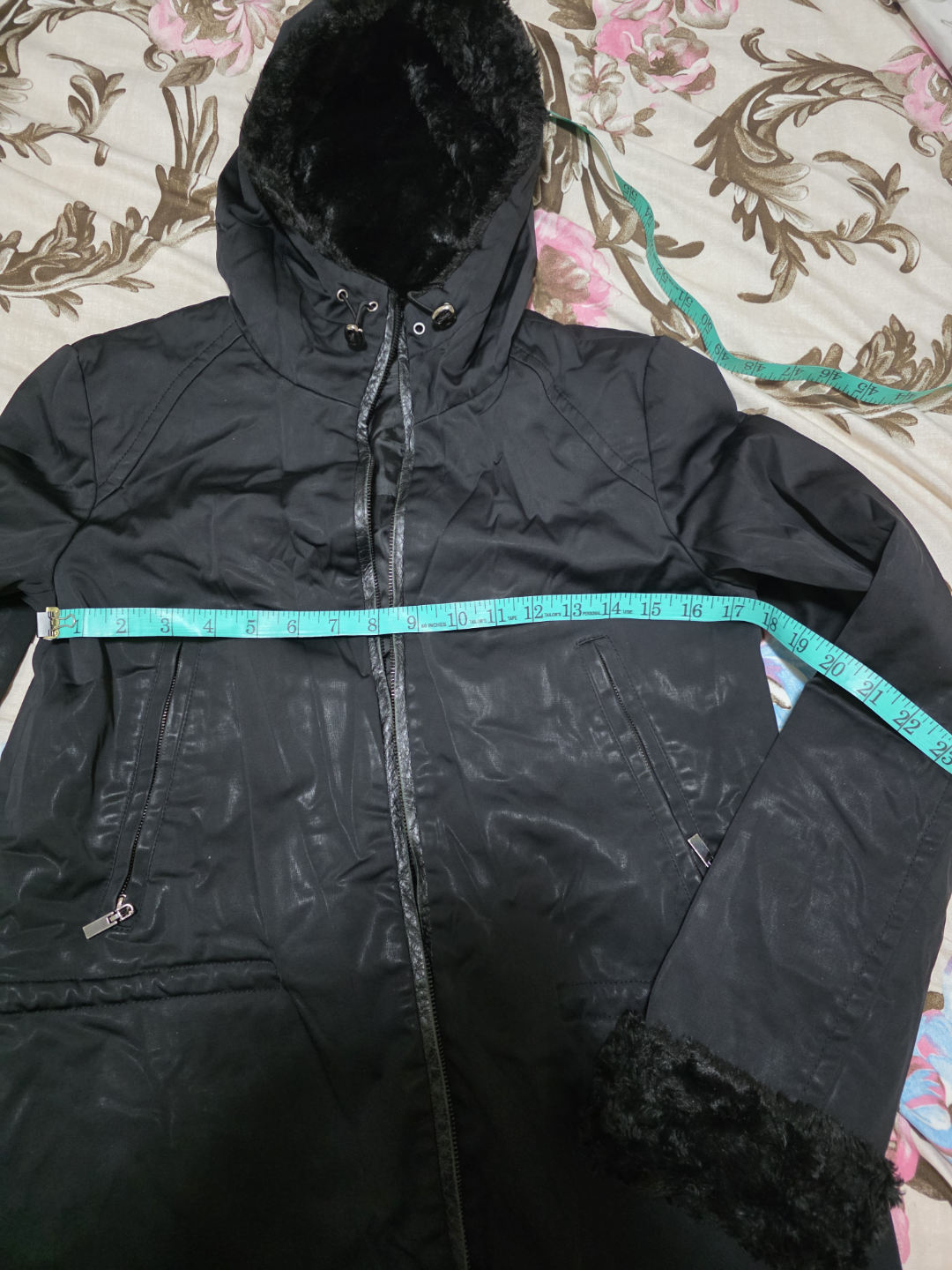 Warm winter jacket. Features a black, faux fur lined hood and cuffs. Zipper closure. Two front pockets. Looks great with jeans or leggings.