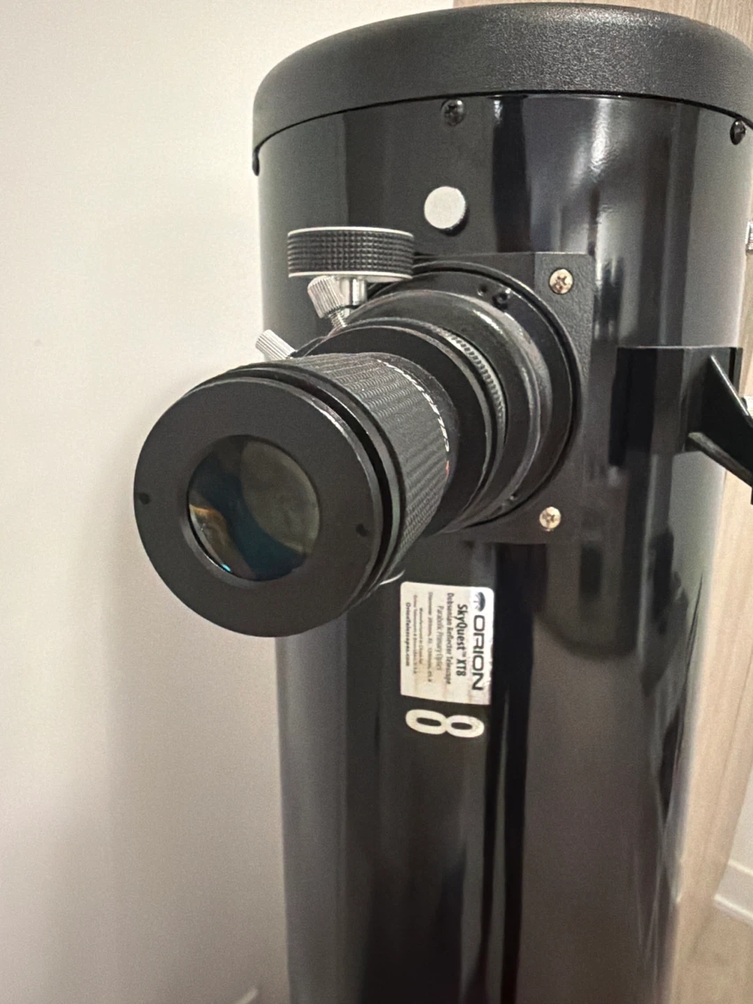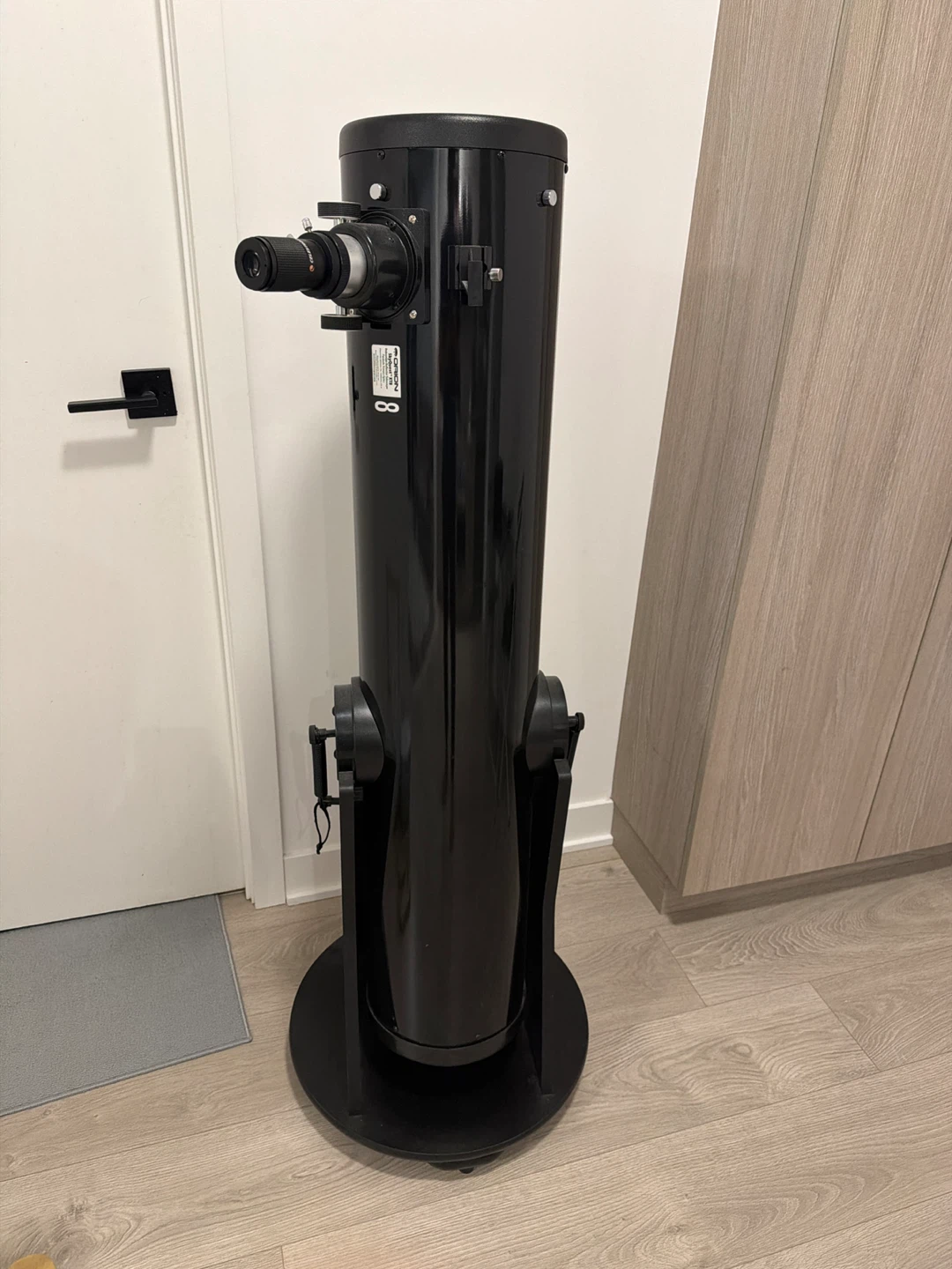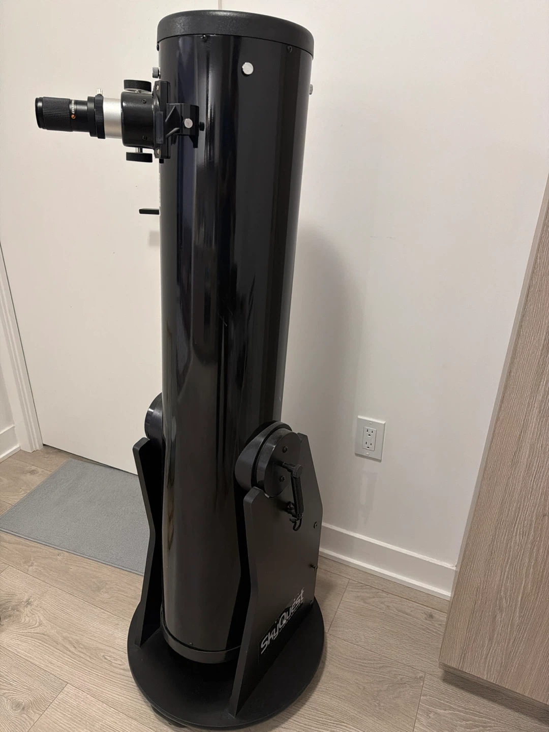 This is an Orion SkyQuest XT8 Dobsonian telescope. It's black with an 8-inch aperture. Great for viewing celestial objects!