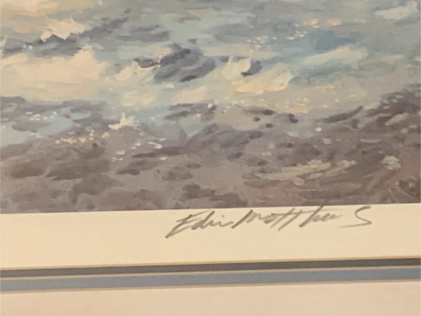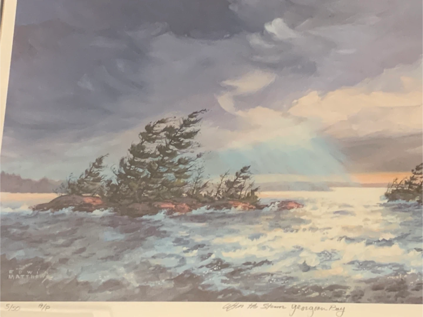 Edwin Matthews is well known for his stunning Canadian landscapes, especially scenes from Georgian Bay, Muskoka, and Algonquin Park. This piece captures the dramatic beauty of Ontario’s cottage country after a storm – calm water, rugged shoreline, and incredible atmosphere.