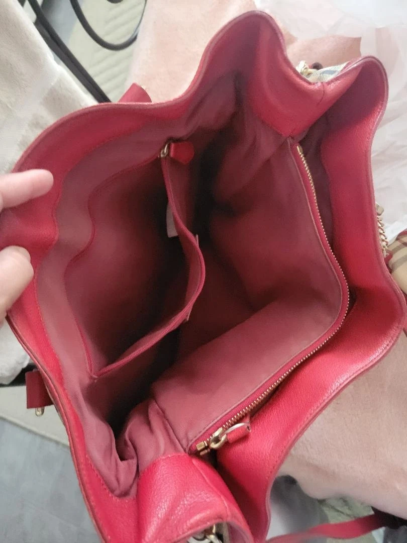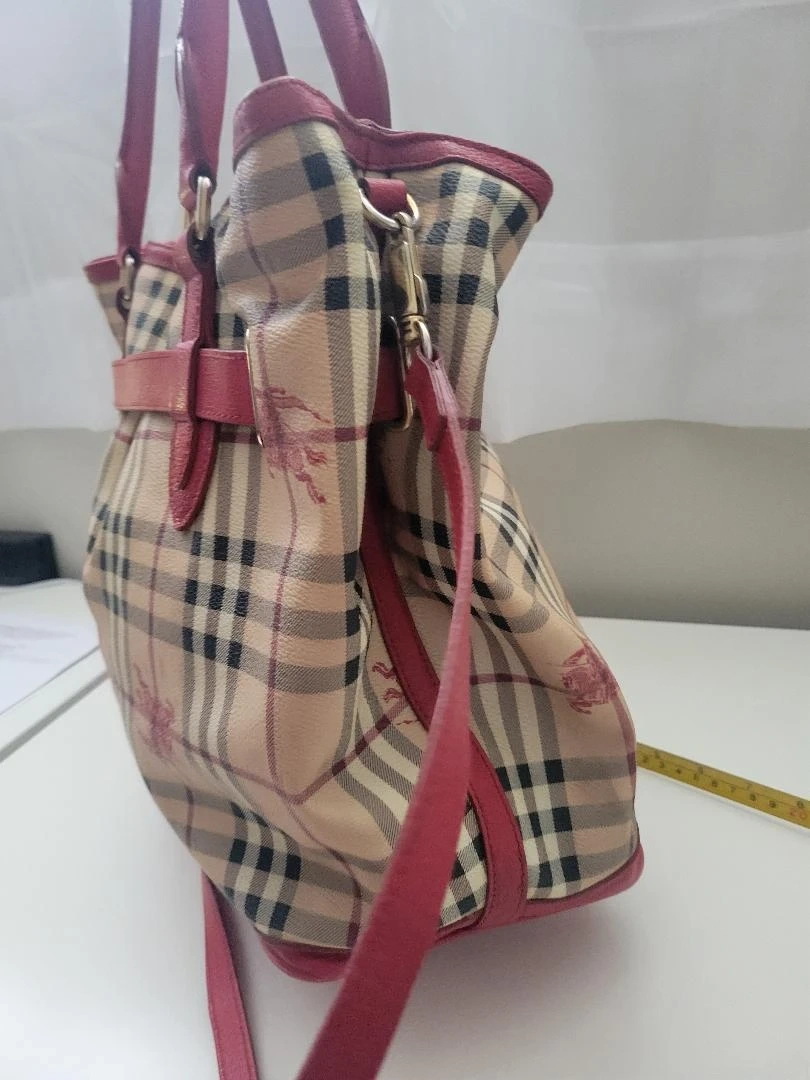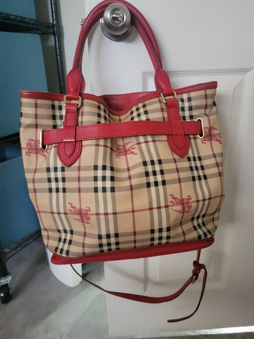 This iconic Burberry tote showcases the classic Haymarket check pattern with striking red leather accents. It's spacious and includes a detachable shoulder strap for versatility. Some wear on the leather handles is visible.