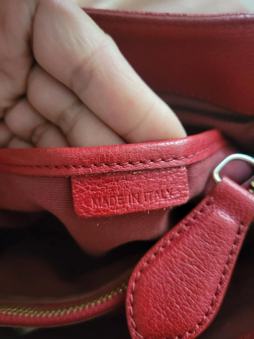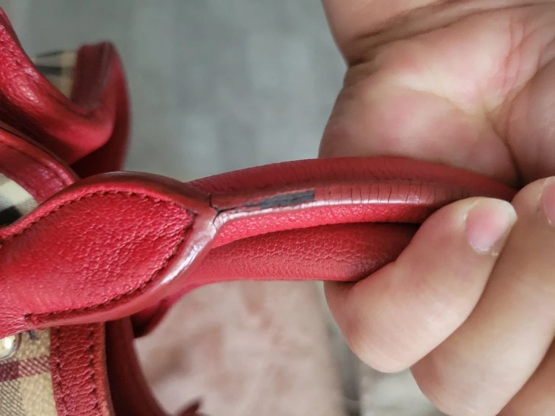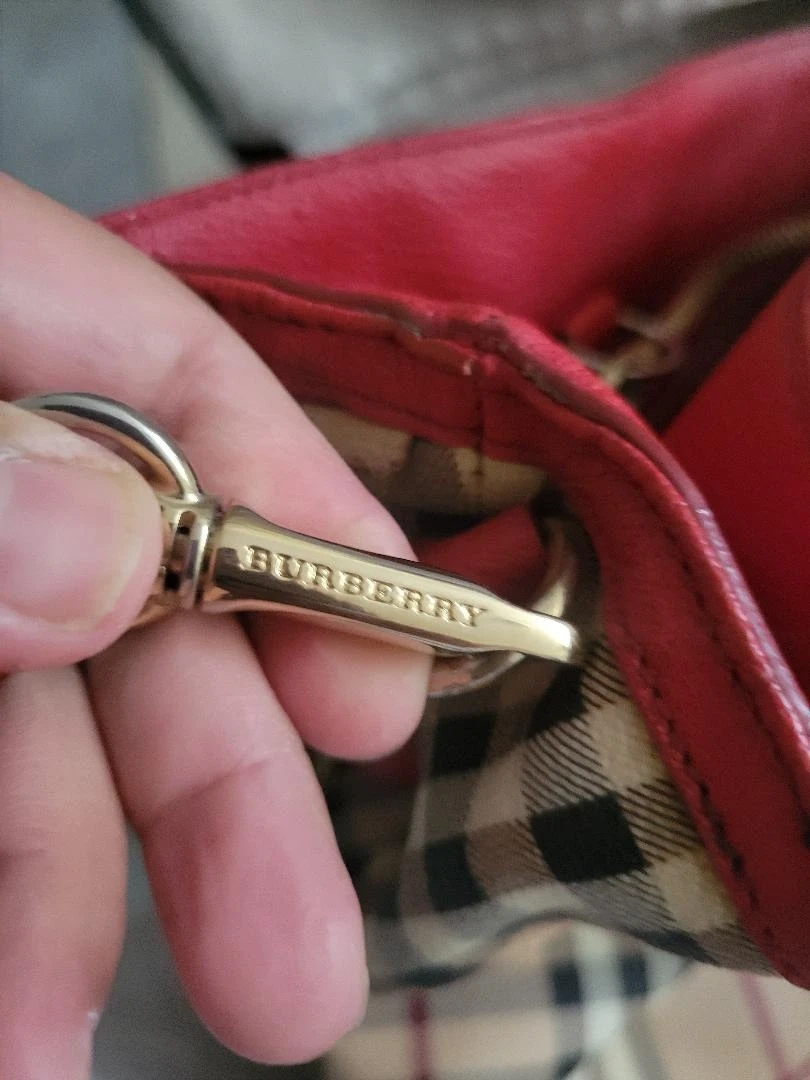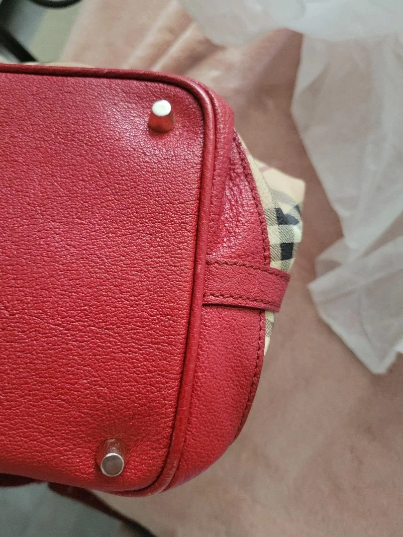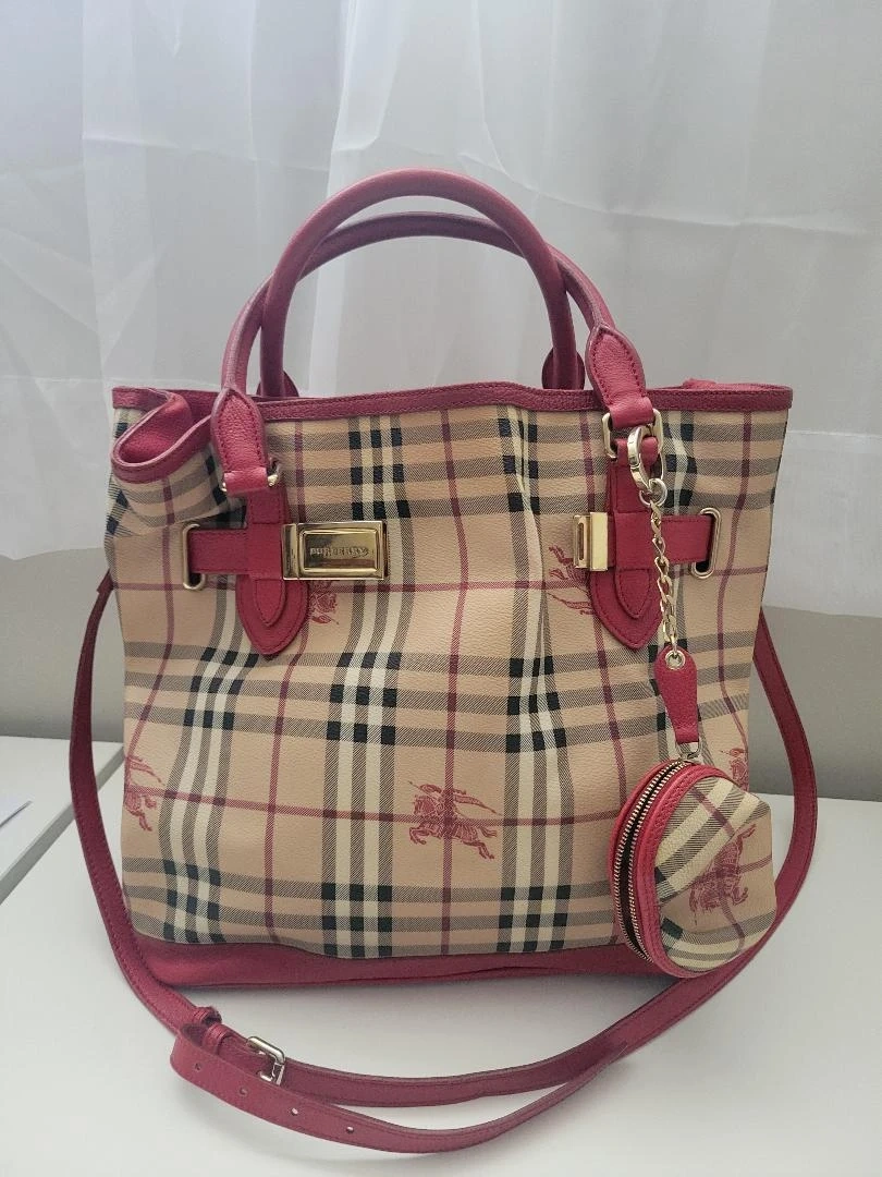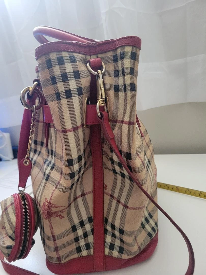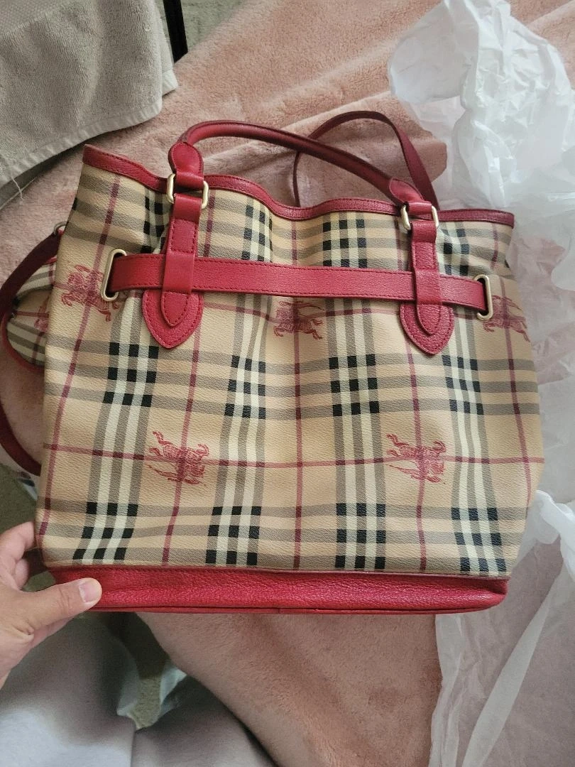 This iconic Burberry tote showcases the classic Haymarket check pattern with striking red leather accents. It's spacious and includes a detachable shoulder strap for versatility. Some wear on the leather handles is visible.