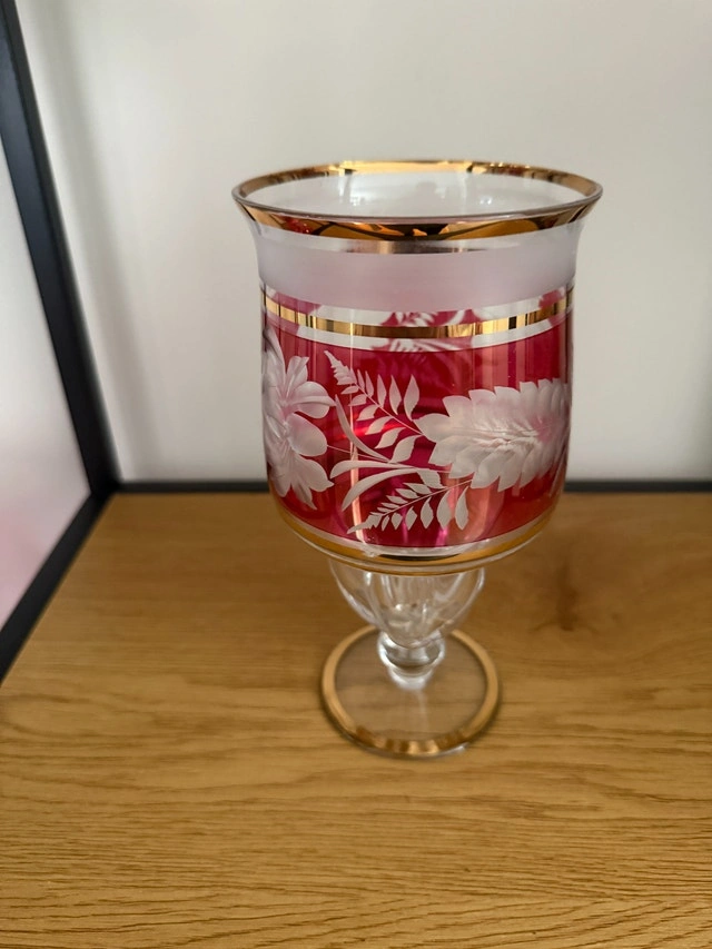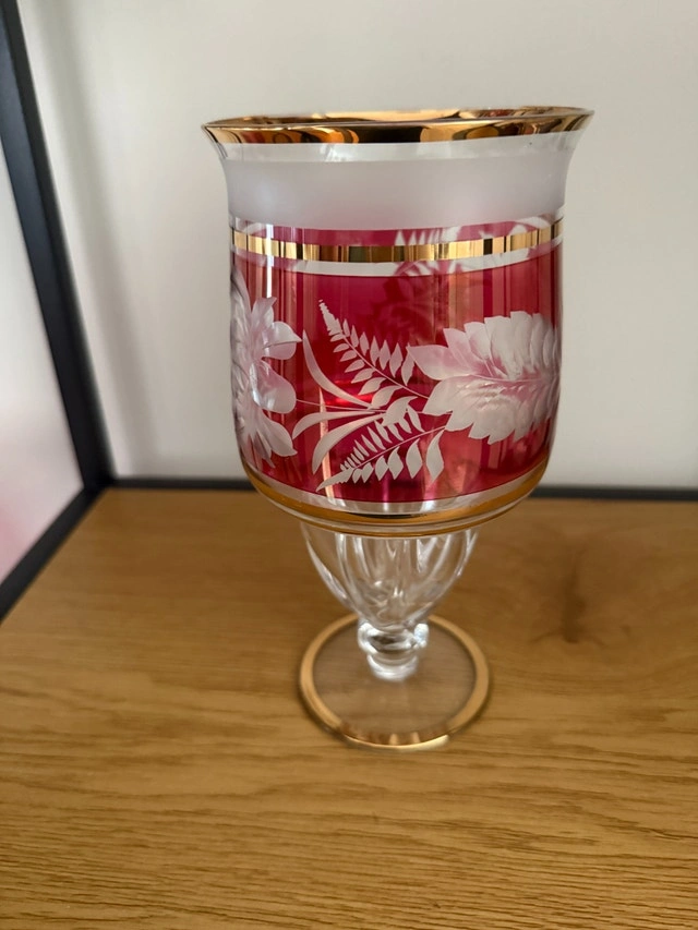 Lovely cranberry crystal vase etched with flowers and leaves, trimmed in gold leaf. Preowned - great condition. No chips or cracks (refer to pictures). Cash accepted.