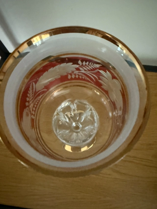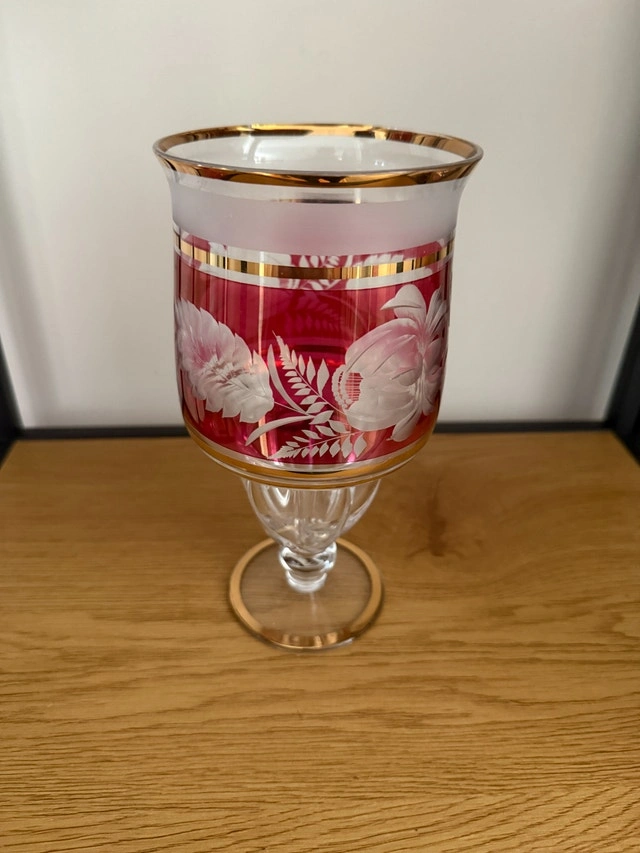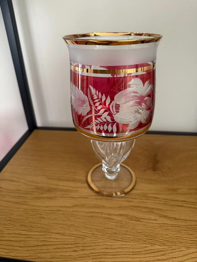 Lovely cranberry crystal vase etched with flowers and leaves, trimmed in gold leaf. Preowned - great condition. No chips or cracks (refer to pictures). Cash accepted.