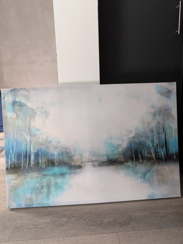 Canvas wall art featuring an abstract landscape with blue and grey tones. This piece is stretched on a wooden frame and ready to hang. Bought from winners It measures 24 inches high by 48 inches wide.