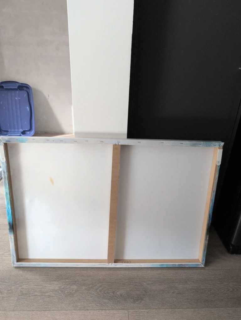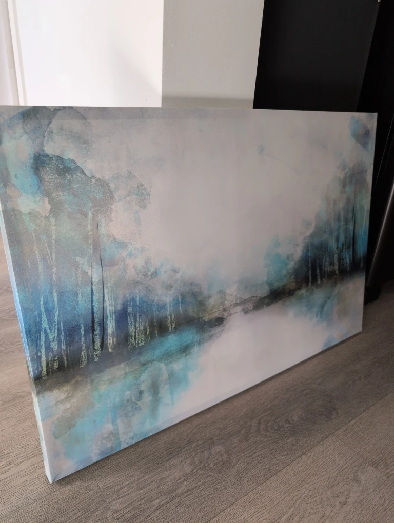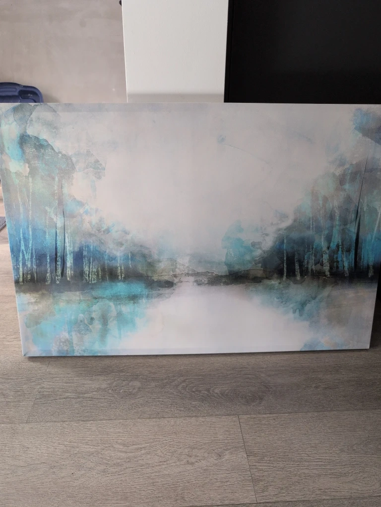 Canvas wall art featuring an abstract landscape with blue and grey tones. This piece is stretched on a wooden frame and ready to hang. Bought from winners It measures 24 inches high by 48 inches wide.