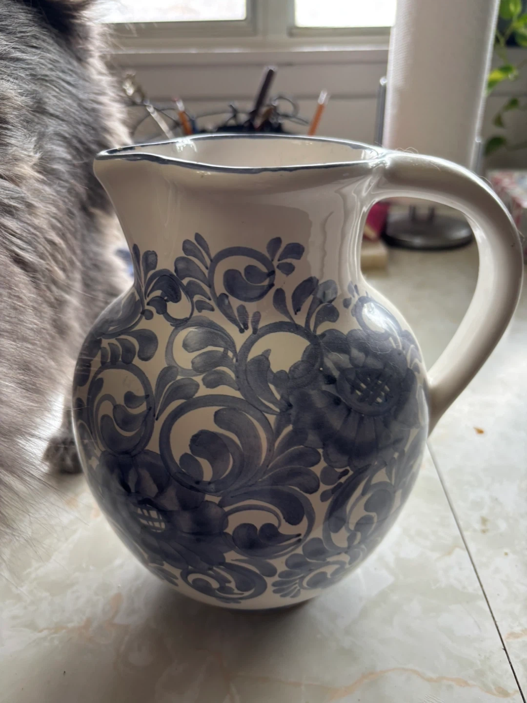 White Ceramic Pitcher with Blue Floral Design