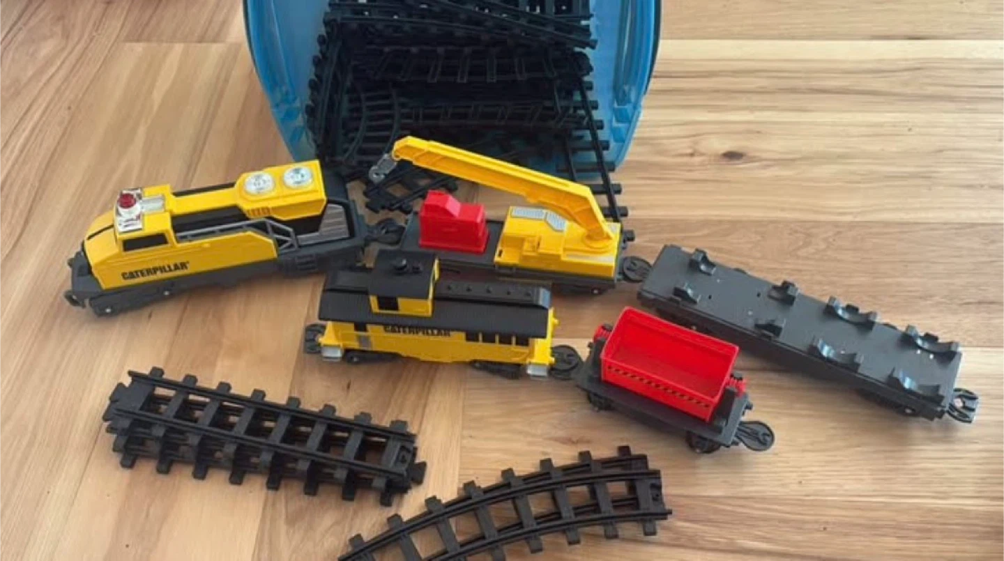 This is a Caterpillar toy train set. It includes multiple train cars and track pieces. The set features yellow and black colours and is made of plastic. Excellent condition and moves independently on the tracks. Forest Heights in Kitchener Pickup