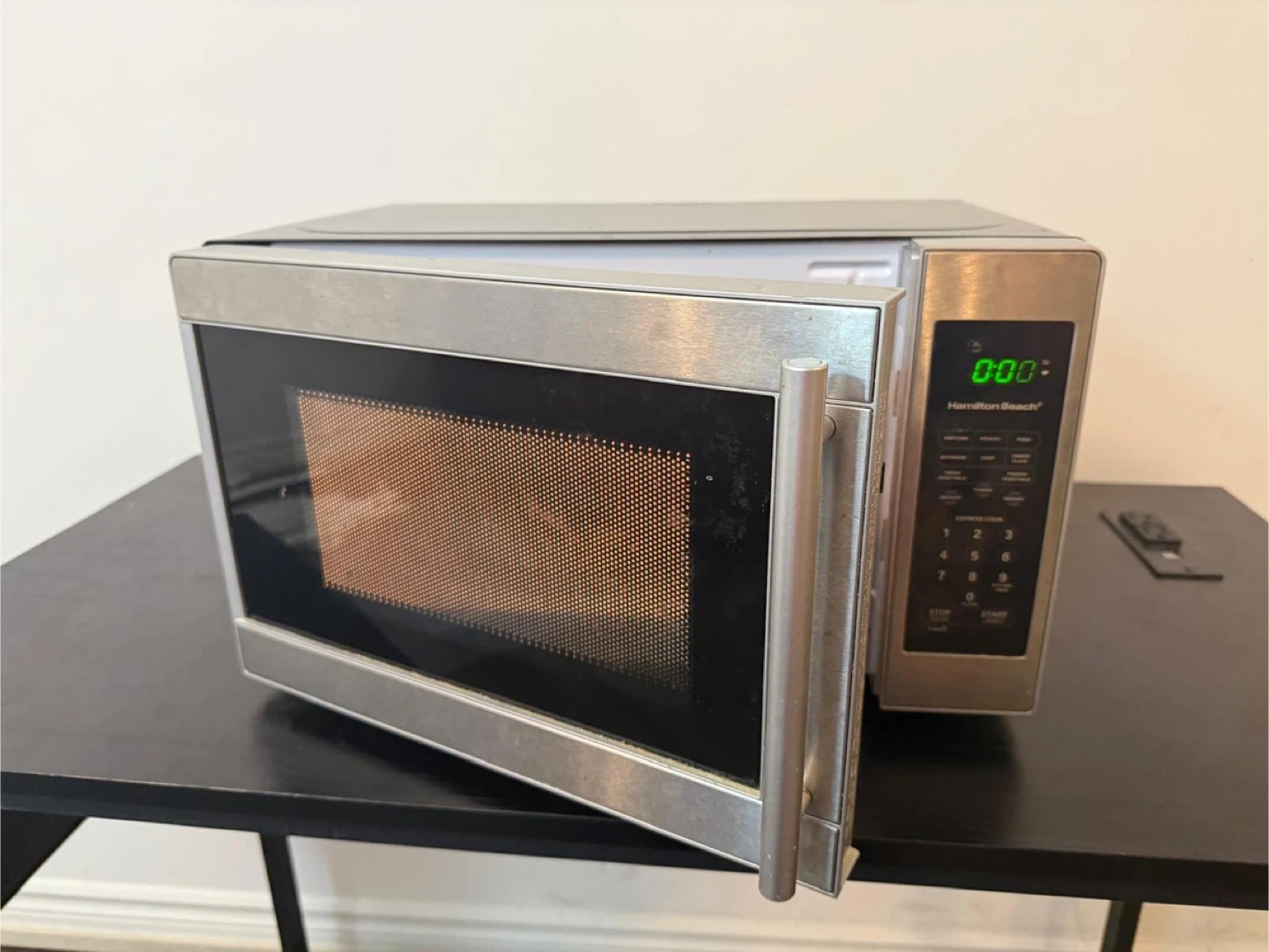 Selling a Hamilton Beach microwave in silver colour. It's in great condition and ready to use. Dimensions are approximately 20.59 x 15 x 11.81 inches.