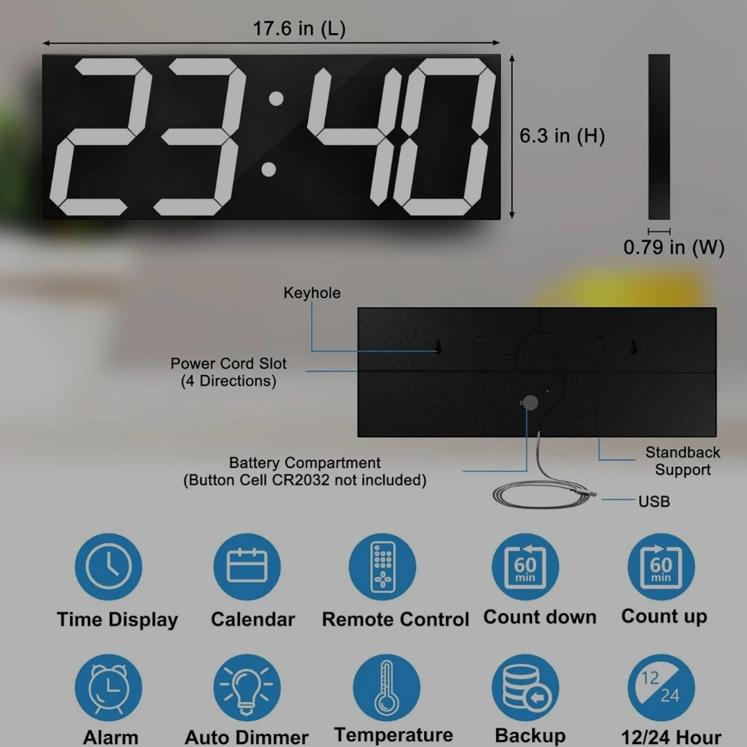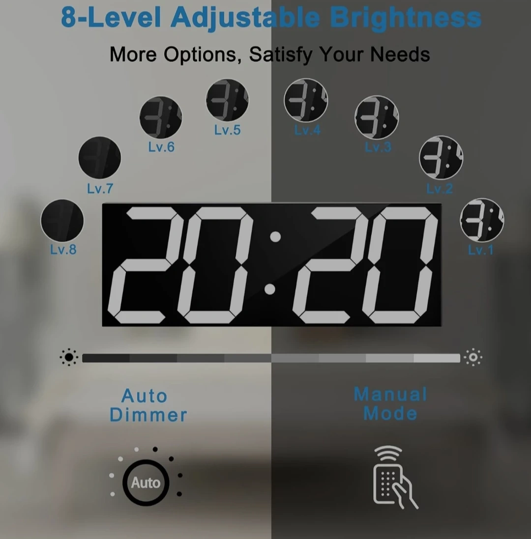 This digital clock features 6-inch numbers with 8 levels of adjustable brightness. It includes time display, calendar, remote control, alarm, auto dimmer, and temperature functions. It's perfect for any room in your home or office!