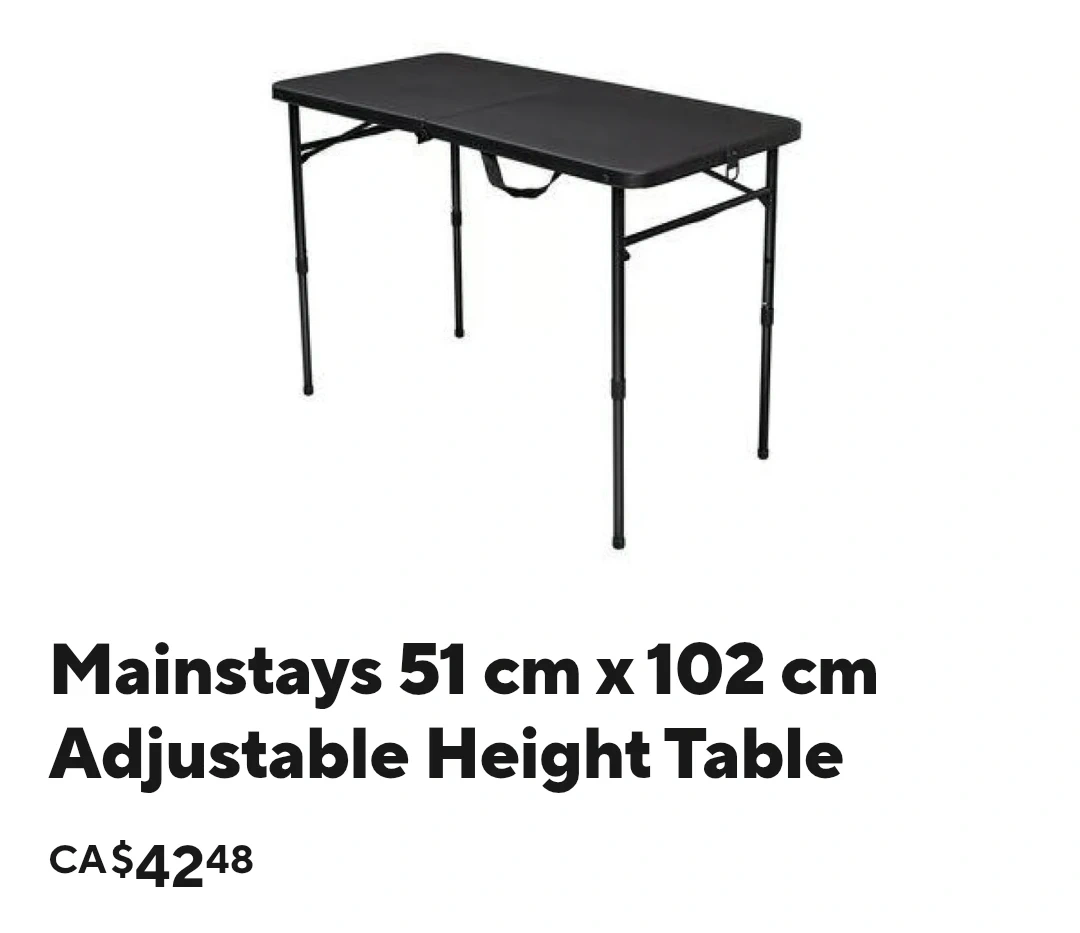This is a Mainstays adjustable height table. It measures 51 cm by 102 cm or 20 inches by 40 inches. The height is adjustable. It's black and made of plastic. This table is handy for various uses like camping or extra workspace!