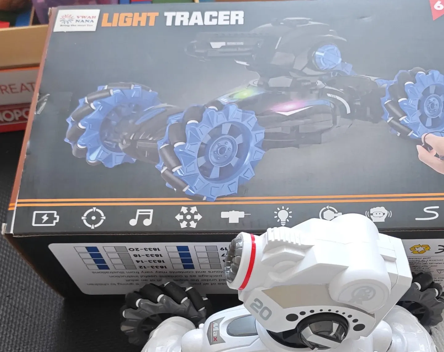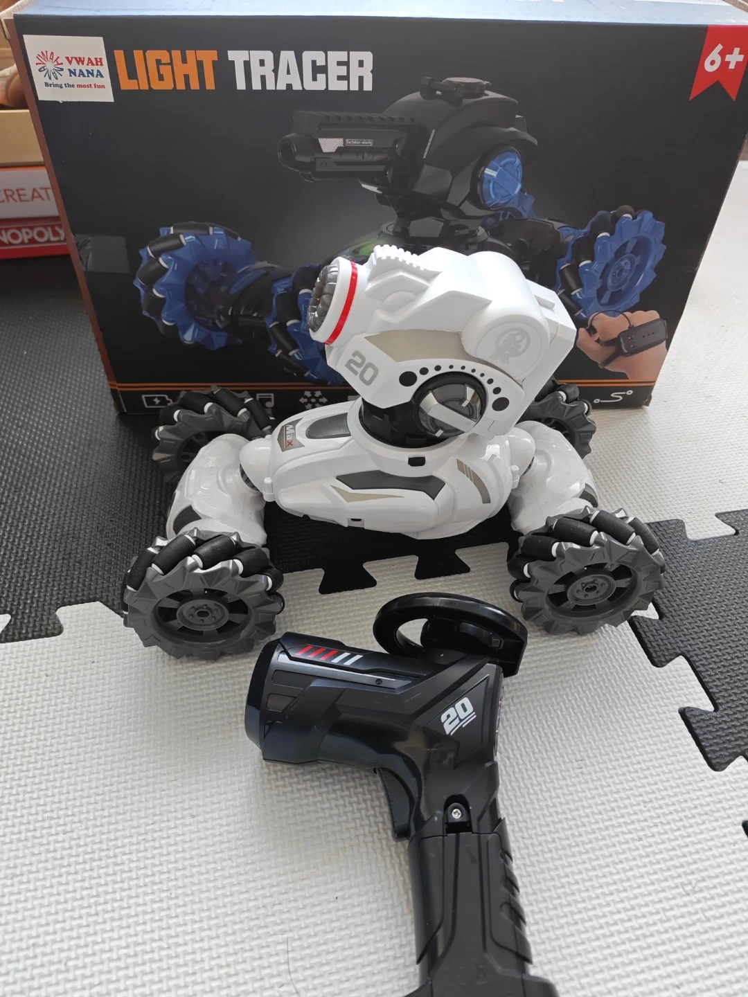 This is a VWAH NANA Light Tracer remote control stunt car. It's a white and black model with unique rotating wheels. Comes with a remote control for action-packed fun. Recommended for ages 6+.