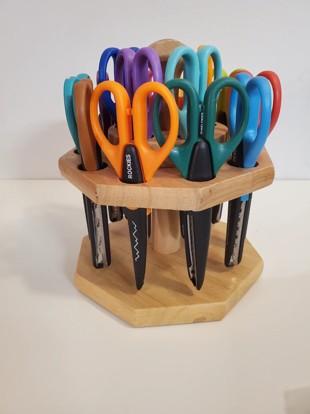 The rotating wooden stand keeps the scissors organized and within easy reach.Â
